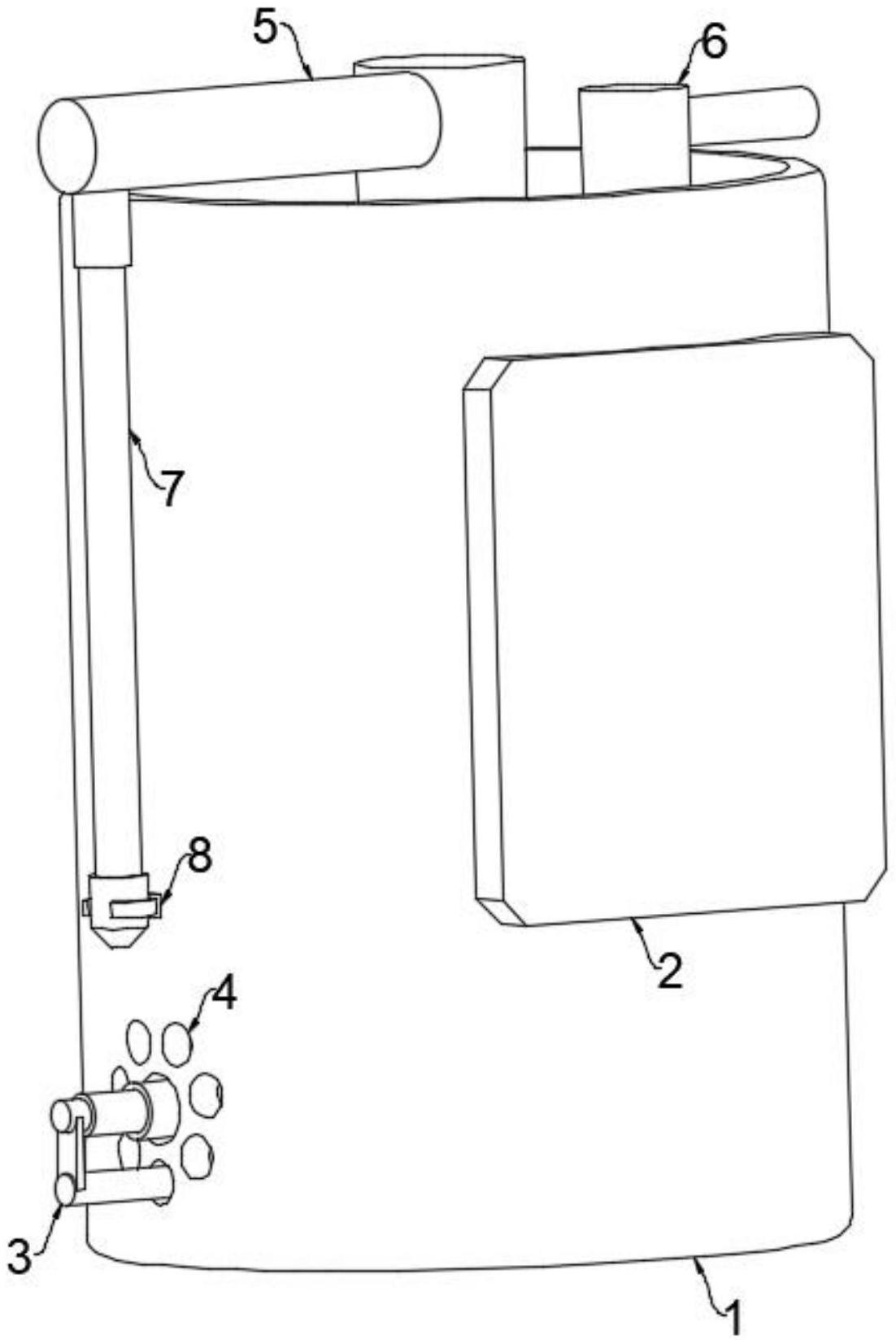 本实用新型公开了乳制品用便携式取样检测装置,包括检测桶,所述检测桶内螺纹安装有盖盘,所述盖盘上固定安装有单向出液管、单向进液管,所述单向进液管与检测桶之间通过卡合机构安装有取样管,所述检测桶内通过滑动机构安装有升降盘,且升降盘上固定安装有多个检测柱,所述检测桶上固定安装有与多个检测柱相配合的显示板,所述检测桶内通过转动辊转动安装有收卷辊,且收卷辊与升降盘之间固定连接有牵引绳,所述升降盘与检测桶之间固定安装有多个顶升弹簧杆。优点在于:本实用新型整体体积较小,且携带方便、操作便捷,能够迅速完成乳制品的取样、质量检测以及乳制品的排料,无需进行乳制品的来回转运,功能性较强,实用性较强。
