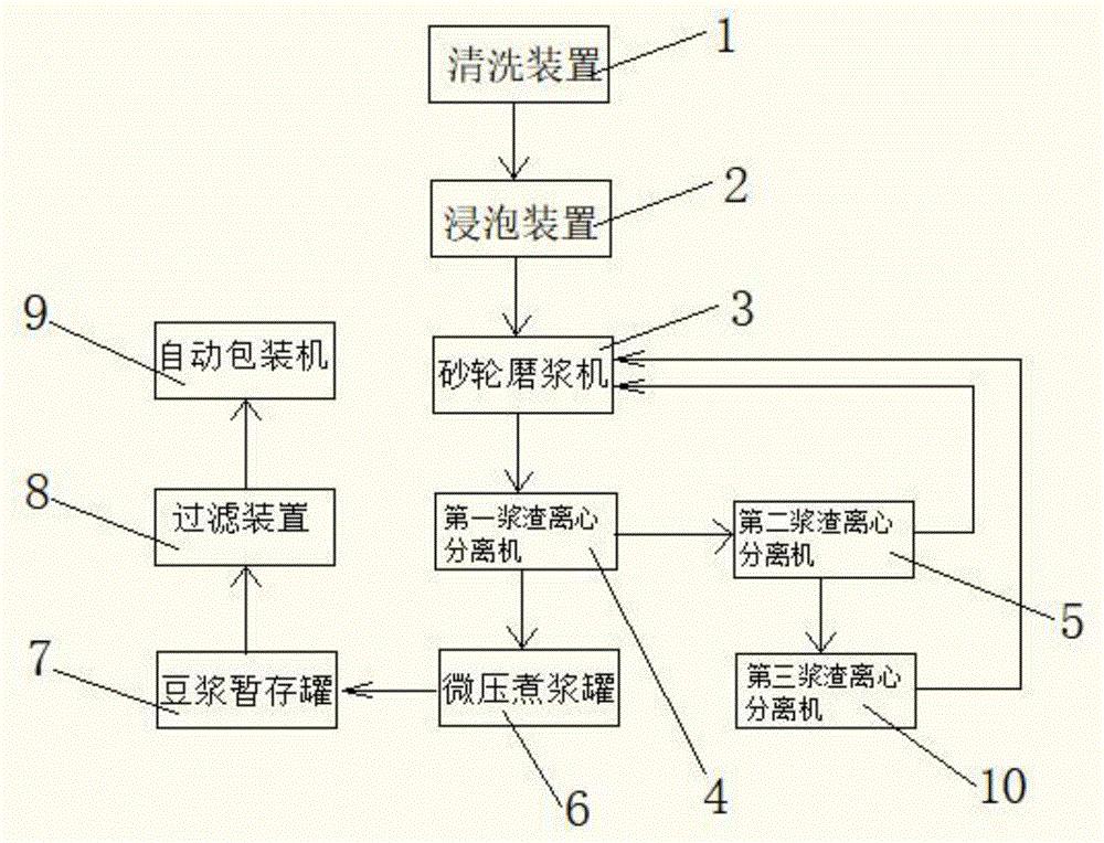 本实用新型涉及一种生浆法制备豆浆的生产系统,包括清洗装置、浸泡装置、砂轮磨浆机、第一浆渣离心分离机、第二浆渣离心分离机、微压煮浆罐及过滤装置,所述清洗装置通过导料管依次与所述浸泡装置、砂轮磨浆机、第一浆渣离心分离机、微压煮浆罐及过滤装置连接,所述第二浆渣离心分离机通过导料管分别与第一浆渣离心分离机及砂轮磨浆机连接。本生产系统采用机械化清洗、浸泡、磨浆、浆渣分离、微压煮浆、振动过滤及包装,机械自动化程度高,加工量大,明显降低工人的劳动强度,降低生产成本、生产效率高。
