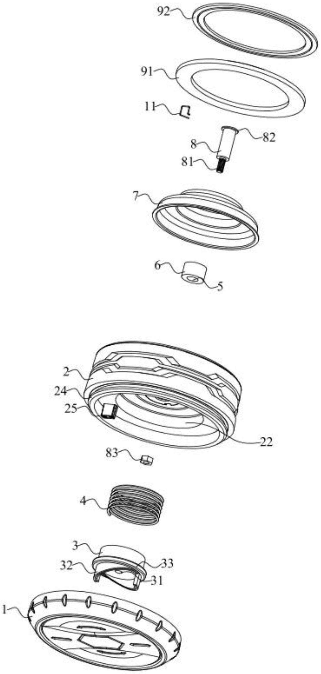 本实用新型实施例涉及泡茶杯具技术领域,公开了一种水杯杯盖及茶水分离杯,包括杯盖旋转壳、杯盖下壳、凸轮、凸轮弹簧、螺柱硅胶密封圈、五金内盖、和凸轮螺柱,所述杯盖旋转壳转动连接在所述杯盖下壳的上方,所述五金内盖固定在所述杯盖下壳的下方,所述五金内盖、所述螺柱硅胶密封圈和所述杯盖下壳都设置有中心孔,所述凸轮螺柱的一端依次穿过所述五金内盖、所述螺柱硅胶密封圈和所述杯盖下壳与所述凸轮固定连接,所述杯盖旋转壳上设置有第一叶轮,所述第一叶轮与所述凸轮抵接,所述凸轮弹簧的一端与所述凸轮抵接,所述凸轮弹簧的另一端与所述杯盖下壳抵接,本实用新型实施例水杯杯盖的结构简单和稳定,用户使用方便,方便用户控制茶水的浓度。