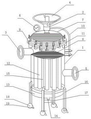 本实用新型公开了一种多功能液体过滤器,包括筒体、下风口,所述的下风口上设有排污口,所述的排污口上端设有支脚,所述的支脚上端设有筒体,所述的筒体内部设有滤芯,所述的滤芯右端设有净化水口,所述的净化水口左上端设有细滤网,所述的细滤网左端设有污水口,所述的污水口上端设有密封圈,所述的密封圈上端设有禁锢装置,所述的禁锢装置上端设有粗滤网,本实用新型结构简单,使用方便,设有滤网和细滤网使得过滤速度快,保证过滤量稳定、过滤效率始终较高,采用不锈钢原料易于保养,并且设有万向轮,便于移动机器工作由此也节省了大量的人力及经济成本。
