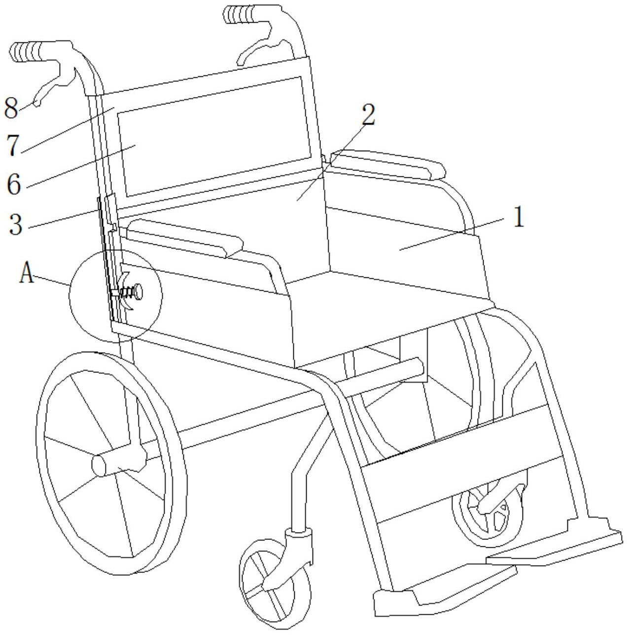 本实用新型公开了一种轮椅用靠背升降调节装置,包括一种轮椅用靠背升降调节装置,包括轮椅本体及轮椅本体上靠背板两侧的支撑立柱,所述支撑立柱的数量为两根,且延靠背板两侧对称分布,两根所述支撑立柱远离靠背板侧均开设有升降滑槽。通过设置升降杆的底端转动连接有升降限位机构,能够在使用过程中利用升降限位机构对靠背调节后的位置进行限位,避免其发生移动,使得处于坐姿状态的病员能够在无需他人帮助的情况下,完成靠背升降调节。