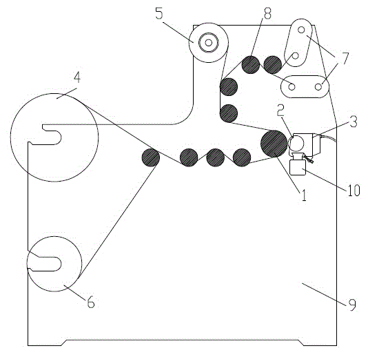 本实用新型是一种锯齿胶带分切装置,包括背辊(1)、刀片(2)、气刀架(3)、胶带放料卷辊(4)、料边收卷辊(5)、隔离膜回收辊(6)、胶带收卷架(7)、传动辊(8)、架体(9),胶带放料卷辊(4)和隔离膜回收辊(6)装在架体(9)的左侧,胶带放料卷辊(4)安装在隔离膜回收辊(6)的上部,架体(9)的右侧装有气刀架(3)和胶带收卷架(7),气刀架(3)上装有刀片(2),刀片(2)旁边装有背辊(1),架体(9)还装有料边收卷辊(5)和传动辊(8),气刀架(3)底部设有架座(10),每个气刀架(3)都通过排气管与气泵连接,刀片(2)为锯齿状,传动辊(8)装有编码器,胶带收卷架(7)为两个。本实用新型的优点是:1、胶带容易撕口。2、避免粘连拉丝、脱纱的现象。3、提高工作效率。4、精度高,减少人工。