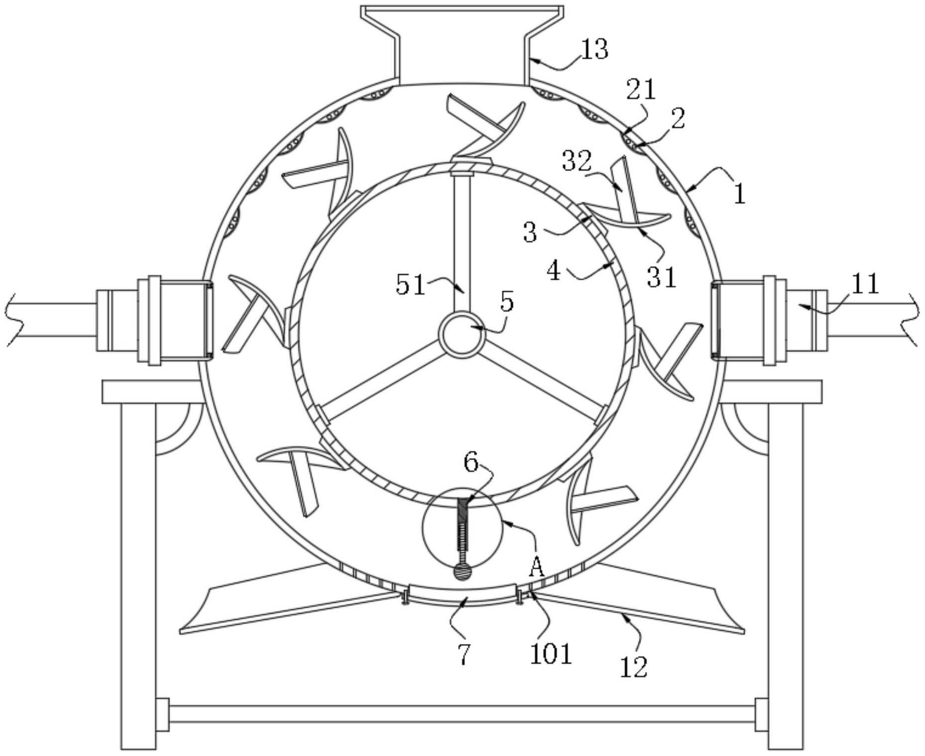 本实用新型属于芝麻加工设备技术领域,尤其为一种低温方法分离芝麻有益成分的生产装置,包括用于预处理的箱体,所述箱体的两端均设有用于加速烘干的热风机,所述箱体的内壁固设有保护壳,所述保护壳的内侧设有用于加热的电热丝;在将芝麻集中通过入料斗投入箱体内之后,热风机吹风将芝麻表面残留的水分分离,电热丝起到对箱体内部温度提高增快烘干效率的作用,之后通过驱动机构驱动连接杆带动连接筒转动,在转动的过程中芝麻受到环形分布的弧形翻料板和其内侧的辅翻料板在循环转动的过程中分层将芝麻翻拨,使得堆积于底部的芝麻能够均匀受风,增加了受风面积,从而有效提高了烘干效果,提高了作业效率。