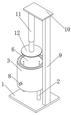 本实用新型公开了一种提高花生油出油率的残渣过滤装置,包括底板,底板的顶部固定连接有固定杆,固定杆的顶端固定连接有储油罐,储油罐内腔的侧面固定连接有支撑板,支撑板的中部转动连接有转动杆,转动杆的顶端固定连接有位于储油罐内的过滤桶,过滤桶的侧面和底部均开设有第一滤油孔,储油罐侧面的出油口处连通有出油管,底板的顶部固定连接有支撑杆,支撑杆的顶端固定连接有固定板,固定板的底部固定连接有第一电动伸缩杆,第一电动伸缩杆的伸缩端固定连接有研磨板,通过对花生油中的残渣进行旋转和研磨的方式,将残渣中携带的油脂过滤收集,提高了花生油的出油率,过滤后的残渣方便进行清理,也避免了过滤孔被堵塞的现象。