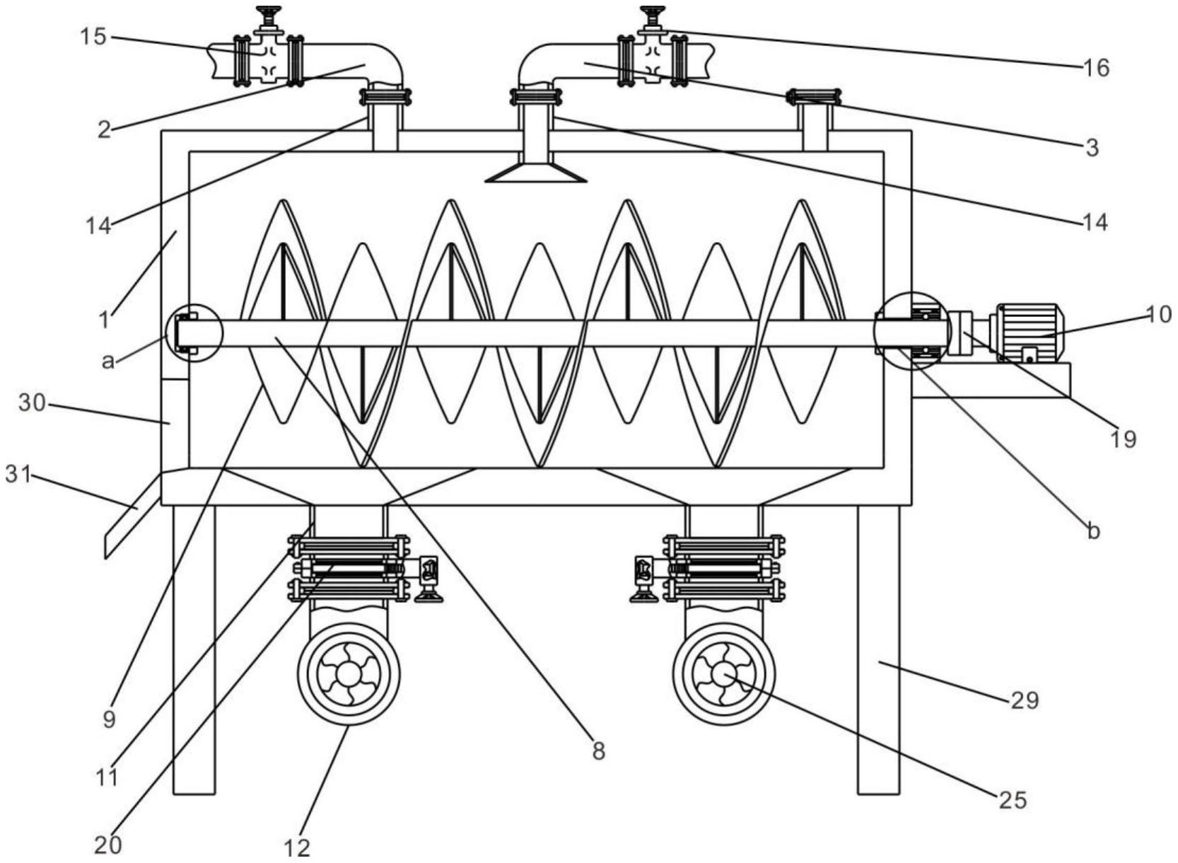 本实用新型公开了一种芳香油加工用提炼罐,包括提炼罐,提炼罐上端分别装设有蒸汽导管与冷却导管,提炼罐两侧内壁上分别设有转动槽与转动孔,转动槽与转动孔内分别装设有主轴承与副轴承,主轴承与副轴承内贯穿有转动轴,转动轴上装设有双螺旋叶片,转动轴伸出端装设有主电机,提炼罐内壁底端上设有若干个出料口,出料口下端装设有输料管。转动轴伸出端装设有主电机,且转动轴上装设有双螺旋叶片,双螺旋叶片对提炼罐内的芳香油植物进行有效的翻堆,使其与蒸汽导管排入的高压蒸汽接触更加充分,位于输料管内的蛟龙叶片轴将提炼罐内的原料进行排出处理,便于对其进行二次提取,提高了提炼罐芳香油的提取效率。