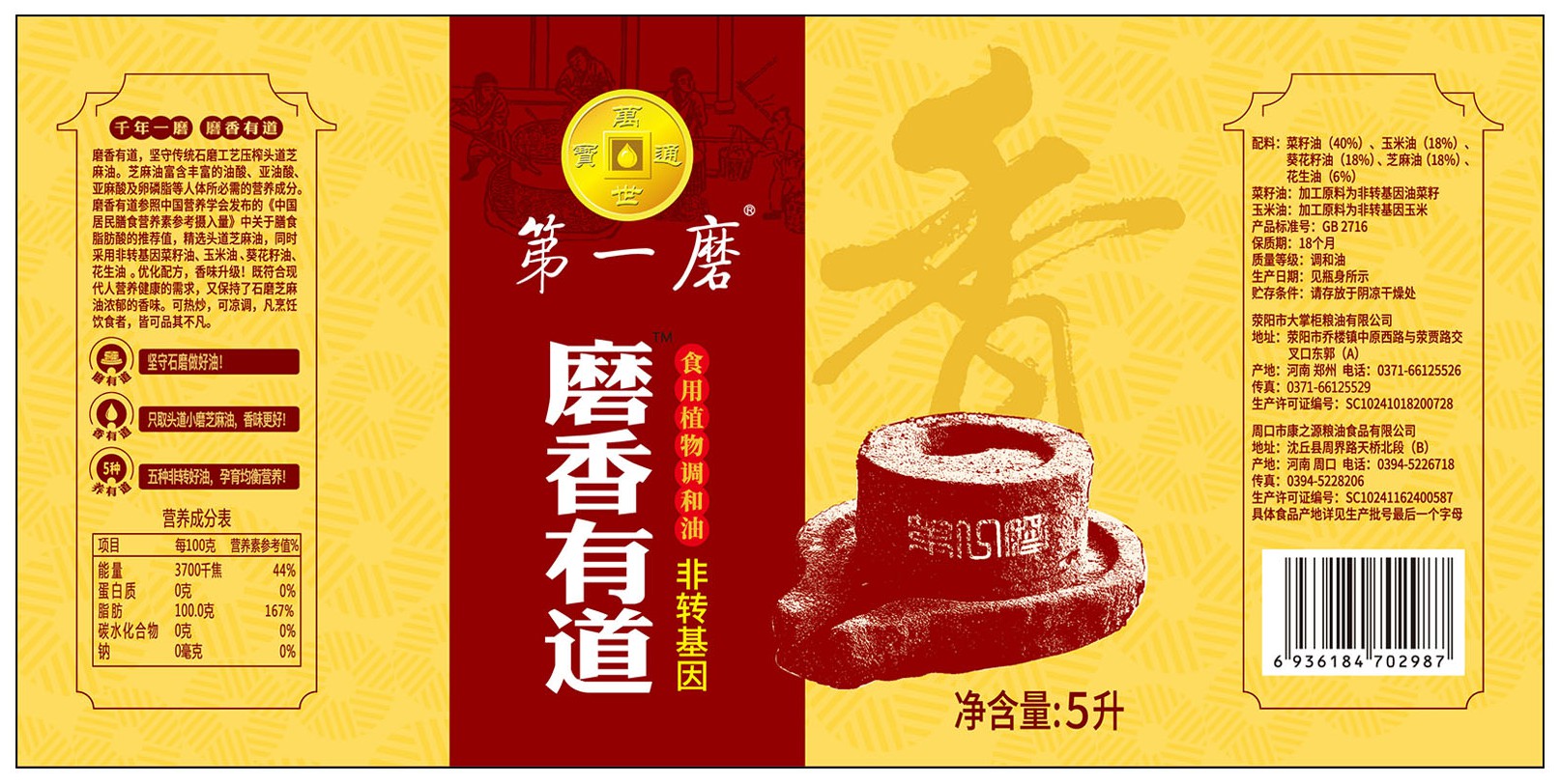 1.本外观设计产品的名称:食用油壶标贴(磨箱有道)。2.本外观设计产品的用途:食用油壶标贴。3.本外观设计产品的设计要点:在于图案与色彩的结合。4.最能表明设计要点的图片或照片:主视图。5.请求保护的外观设计包含色彩。6.本外观设计产品为平面产品,省略后视图;本外观设计产品为平面产品,省略左视图;本外观设计产品为平面产品,省略右视图;本外观设计产品为平面产品,省略仰视图;本外观设计产品为平面产品,省略俯视图。