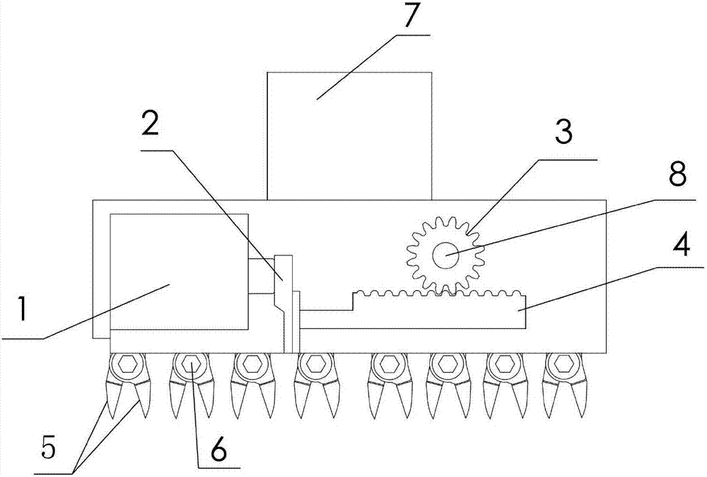 本实用新型公开了一种塑料制品成型后的自动剪切料棒的机械装置,包括驱动系统、传送系统和剪切系统;所述的驱动系统包括气缸和气缸轴,所述的传送系统包括齿轮、齿条、凸轮轴和滑块;所述的剪切系统包括剪钳和丝堵;所述的气缸轴的另一端与齿条的一端固定连接,所述的齿条与齿轮啮合,所述的齿轮与凸轮轴固定连接,所述的凸轮轴位于滑块的凸轮滑槽内,凸轮轴和凸轮滑槽之间为间隙配合,凸轮轴具有在凸轮滑槽内转动的功能。本实用新型由机械手臂控制移动,自动将塑料制品上的料棒剪掉,可自动循环作业,比人工移动速度快。本实用新型配有多个剪钳,一次可以减掉8个塑料制品的料棒,提高了工作效率,适应于塑料制品的大批量生产。