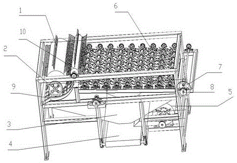 本实用新型公开了一种辣椒分选机,包括机架,所述机架左侧设有进料机构、右侧设有清选机构,所述机架中部设有接料斗,所述接料斗底部设有传送机构,所述传送机构右侧设有风机;本实用新型通过设置进料机构能够把辣椒的绝大多数枝叶都阻挡在外,在通过进料机构中的第一进料滚筒和第二进料滚筒的配合使辣椒均匀的洒落在清选机构上,清选机构中的星型轮会对辣椒进行分拣,高效的实现了对辣椒的分拣功能;本实用新型结构简单、稳定性强、节省动作空间、降低功耗、提高了生产效率,具有良好的市场应用价值。