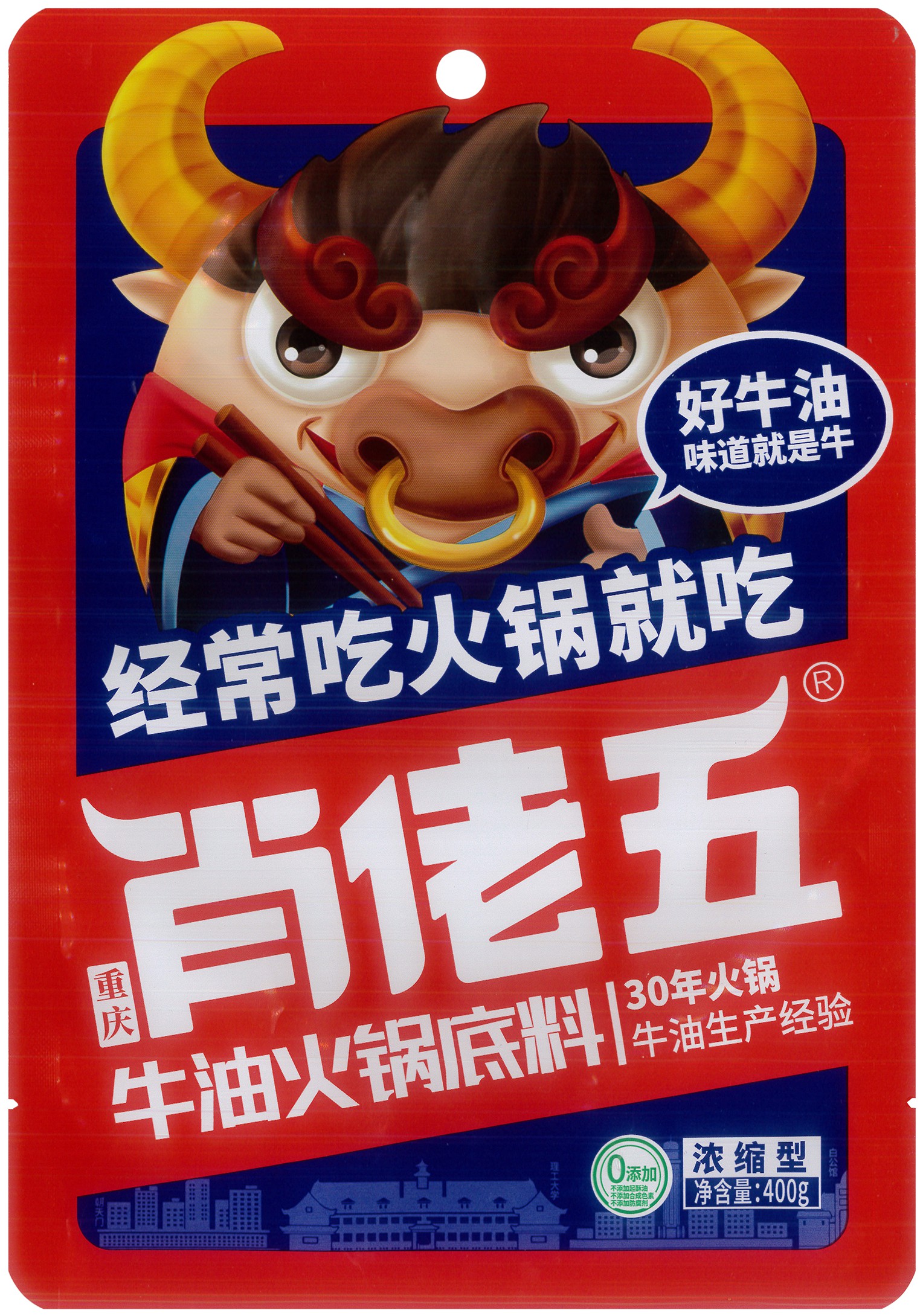 1.本外观设计产品的名称:包装袋(肖佬五牛油火锅底料)。2.本外观设计产品的用途:用于一种包装袋。3.本外观设计产品的设计要点:在于形状与图案的结合。4.最能表明设计要点的图片或照片:主视图。5.本外观设计产品为平面产品,省略其他视图。