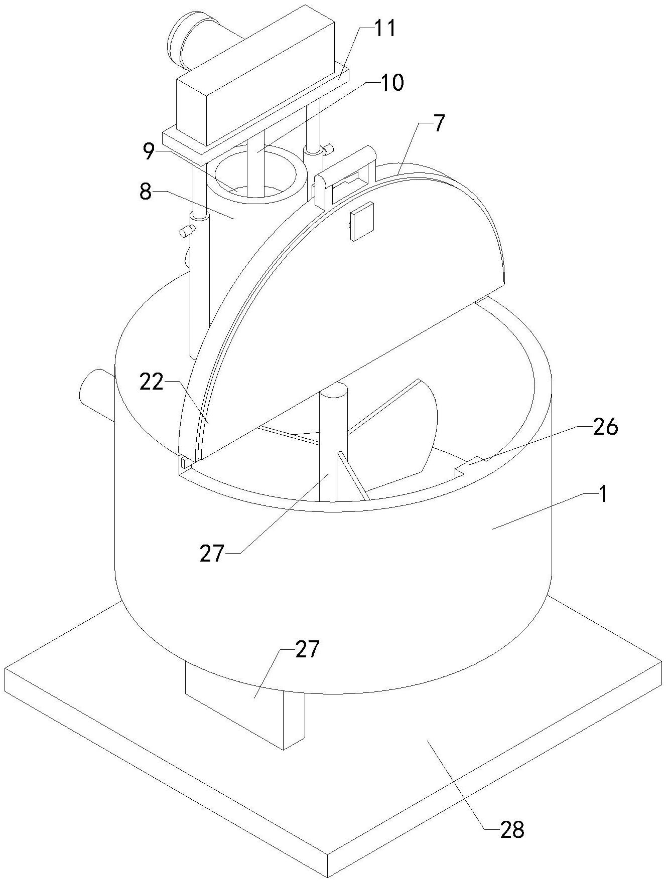 本实用新型涉及纸浆加工的技术领域,特别是涉及一种用于轻型印刷纸生产的阔叶化机浆池,其通过空气加压来使机浆池的机浆更加通常快速的排出,提高可靠性;包括阔叶机浆池、搅拌电机、减速机、开闭阀、出液管、合页、池盖和支撑架,阔叶机浆池底端中部与减速机顶端相连接,搅拌电机输出端连接有支撑架,阔叶机浆池顶端后侧与加压筒底部输出端相连通,加压筒内滑动连接有活塞,活塞顶端通过连接杆与连接片底端中部相连接,连接片上部设置有传动机构,加压电机输出端连接传动机构输入端,传动机构输出端与两组螺杆顶端转动连接,阔叶机浆池顶端后侧的加压筒左右侧分别与一组螺管底端相连接,螺杆与螺管螺装连接,加压筒后侧输入端连通设置有进气口。