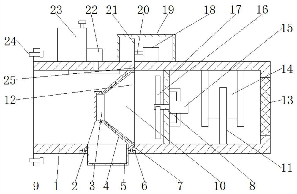本实用新型公开了一种火锅底料炒制用烟气净化系统,包括通风管道,所述通风管道的上表面固定连接有清洗剂箱,所述通风管道的上表面且位于清洗剂箱的右侧设有水泵,所述通风管道的内壁开有环槽,所述环槽的内壁设有齿轮环,所述齿轮环的内壁设有固定环,所述固定环的左侧壁固定连接有粗过滤网,所述粗过滤网的左侧表面设有防油烟过滤膜,所述粗过滤网的左侧设有固定块,所述固定块的外侧表面设有螺纹盖。本实用新型,设有雾化喷头,有利于对烟气的降温,使通风管道的温度不易较高,有利于保护通风管道内部的装置,同时有利于清除污渍,不易使油污存留,有利于装置的长时间使用,且便于清洁。