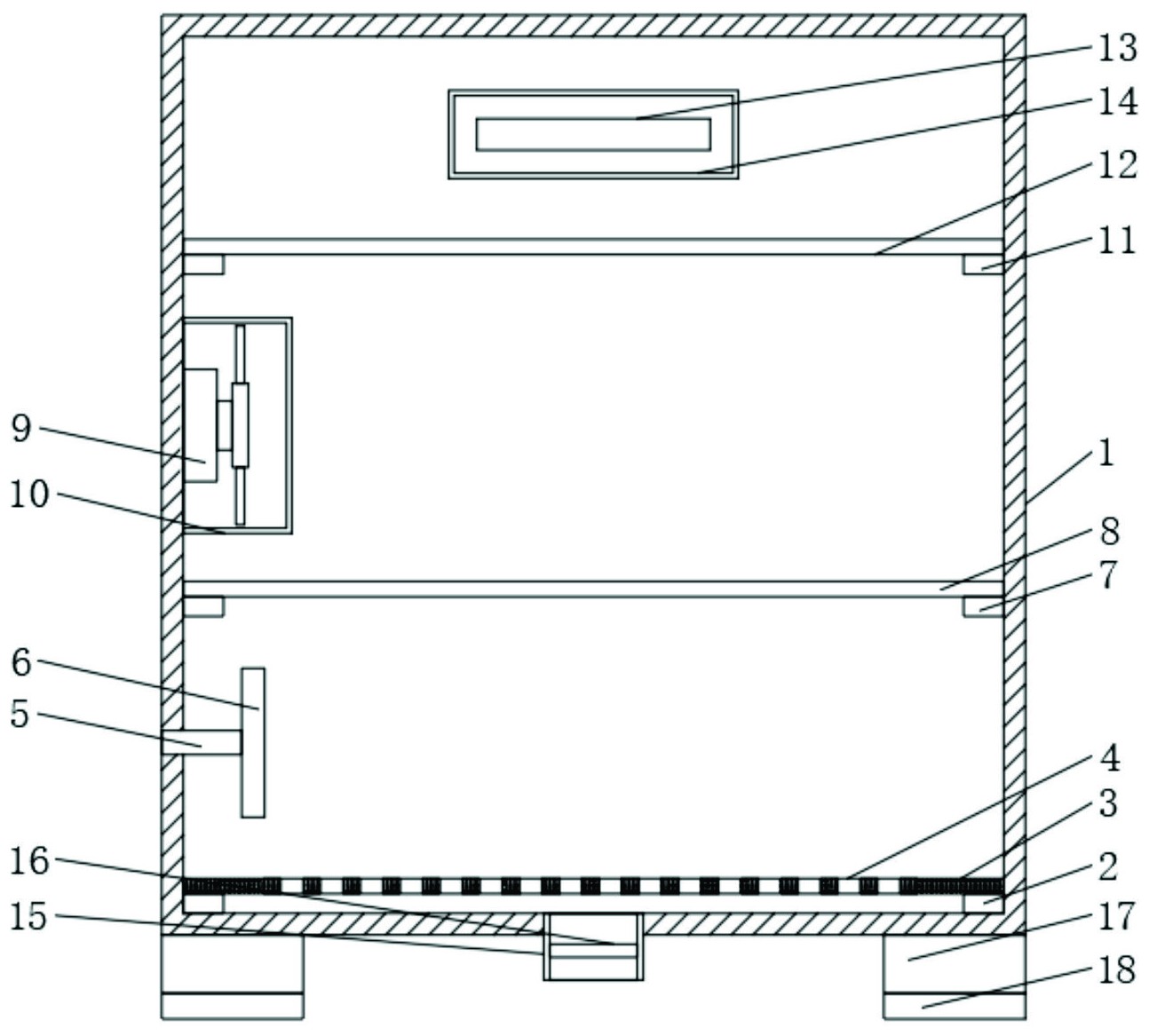本实用新型公开了一种火锅底料微生物检测检验装置,包括本体,所述本体内底部固定连接有多个第一支撑块,所述第一支撑块的顶部固定连接有第一放置板,且第一放置板的内部开设有多个渗水孔;所述本体的内壁固定连接有多个第二支撑块,所述第二支撑块的顶部固定连接有第二放置板,且第二放置板位于第一放置板的上方;所述本体的内壁固定连接有多个第三支撑块,且第三支撑块的顶部固定连接有第三放置板。本实用新型,结构合理,能够有效的为含有火锅底料的培养皿提供不同的培养环境,进而便于检测火锅底料中的微生物含量与种类。