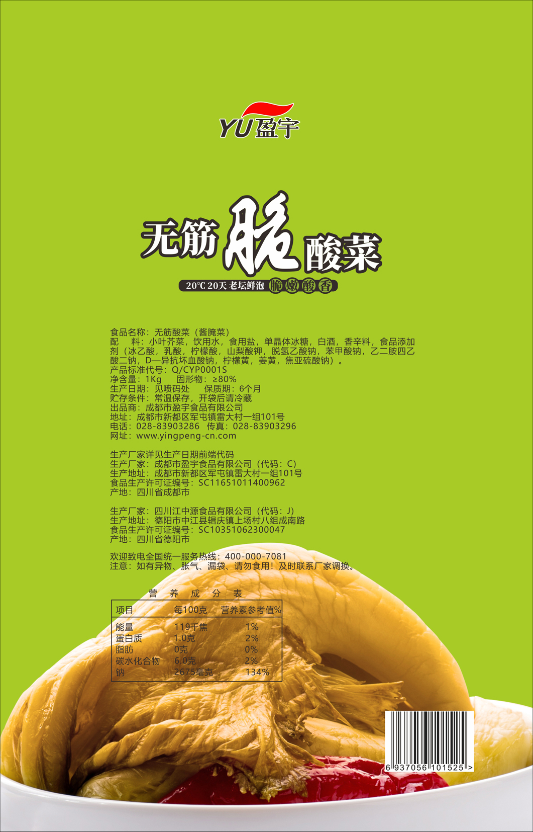 1.本外观设计产品的名称:包装袋(无筋脆酸菜)。2.本外观设计产品的用途:包装食品。3.本外观设计产品的设计要点:在于各视图上的图案。4.最能表明设计要点的图片或照片:主视图。5.本外观设计产品为平面产品,省略其他视图。