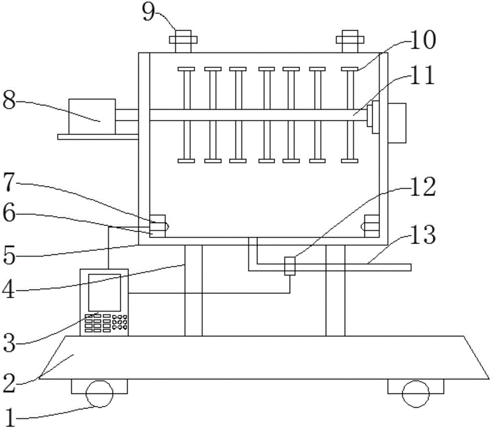 本实用新型公开了一种米醋加工生产用饭曲混合搅拌装置,包括底部移动轮、主支撑架、搅拌驱动电机和电磁流量阀,所述底部移动轮上方设置有移动小车主体,所述移动小车主体与所述底部移动轮通过轴连接,所述移动小车主体上方安装有电气控制箱,所述电气控制箱一侧安装有所述主支撑架,所述主支撑架上方安装有混合搅拌室,所述混合搅拌室内部设置有防磨衬板,所述防磨衬板内部安装有密封保护套,所述密封保护套内部安装有浓度感应头。有益效果在于:1、能够根据对配料浓度进行感应情况,确定饭曲混合状况,检测快速高效,使用效果好;2、通过电磁流量阀对物料进出进行控制,解决了人工配料称重时产生误差的问题。