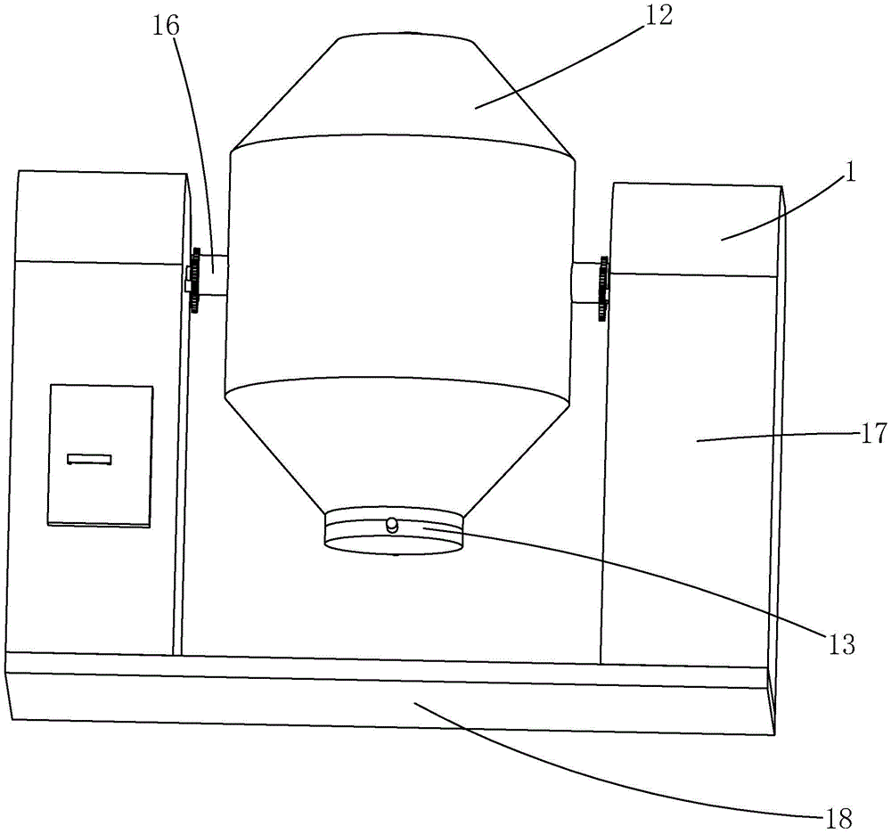 本实用新型涉及一种调味料翻转搅拌装置,包括支撑放置在地面的支座,支座水平转动连接有搅拌罐,支座内还设置有使搅拌罐上下翻转的电机,搅拌罐内转动连接有轴线水平设置的水平轴,水平轴的两端伸出所述搅拌罐并与支座固定连接;搅拌罐与所述电机之间设置有联动搅拌罐转动的传动机构;搅拌罐的内部与搅拌罐的开口端正对的一端转动连接有竖直转轴,竖直转轴上设置有与搅拌罐内壁抵接的清理机构,竖直转轴往复转动且转动角度小于180°,竖直转轴与水平轴之间设置有驱动竖直转轴往复转动的联动机构。可以提高原料利用率,减少残留,也使得在搅拌罐工作结束后,残留在搅拌罐内壁上的原料杂质容易被清理出来。