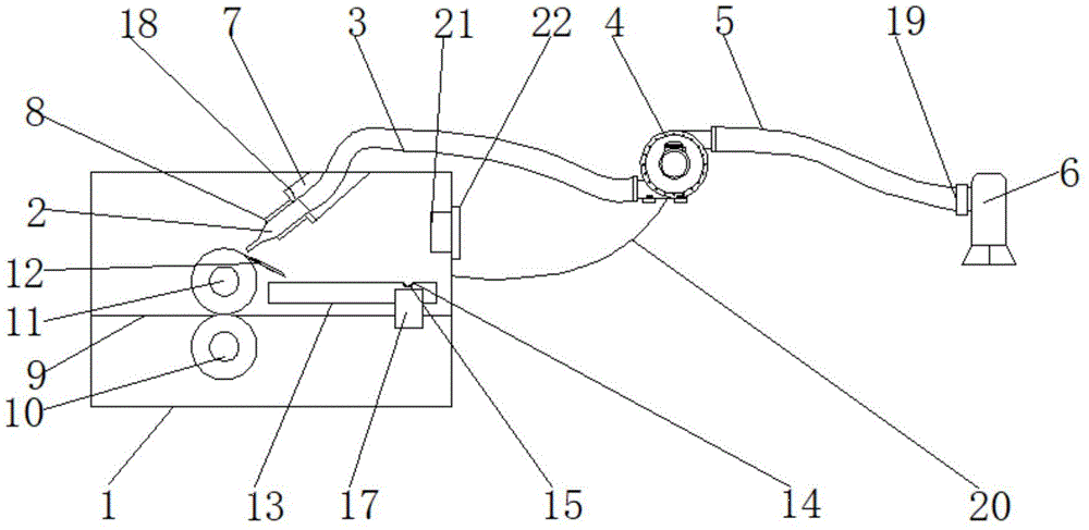 本实用新型公开了一种新型自动收集粉末的结构,包括去粉装置和回收盒,所述去粉装置内连接有吸嘴,所述吸嘴上连接有第一风筒,所述第一风筒的一端连接有抽风机,所述抽风机的一端连接有第二风筒,所述回收盒和抽风机之间通过第二风筒,所述去粉装置内开设有定位槽,所述定位槽的一端设置有定位筒,所述去粉装置内设置有平台,所述去粉装置内设置有除粉胶辊,所述去粉装置内设置有除粉钢辊,靠近除粉钢辊的所述去粉装置内设置有刮刀。其优点在于,更加方便的回收粉末,且通过抽风机抽取刮下的粉末,方便操作人员进行操作,并且能够提醒操作人员粉盒已满,及时处理。