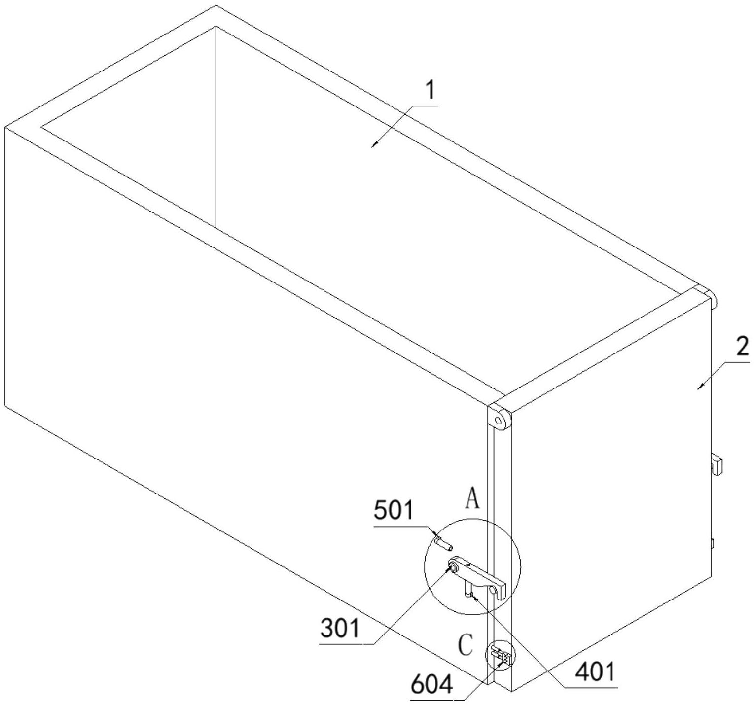 本实用新型提供一种自卸车车厢后门防跳装置,涉及自卸车技术领域,以解决现有的防跳装置不能提高车厢与后门之间的稳定性,长时间使用易发生磨损的问题;包括车厢;所述车厢的右侧转动安装有后门,且后门的前后两侧固定安装有连接柱;所述连接组件共设有两组,且两组连接组件安装在车厢的前后两侧;所述稳定装置共设有两组,且两组稳定装置安装在车厢的前后两侧;所述固定装置共设有两组,且两组固定装置安装在车厢的前后两侧;本实用新型因防跳块B固定安装在两个伸缩柱的右侧,且防跳块B与防跳块A接触,从而避免了后门发生跳动,增加了后门的使用寿命,同时提高了后门的稳定性。