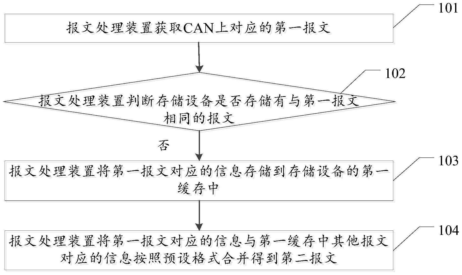 本申请涉及一种报文处理方法及存储设备。该方法包括:获取控制器局域网络上对应的第一报文;判断存储设备中是否存储有与所述第一报文相同的报文;若未存储有与所述第一报文相同的报文,则将所述第一报文对应的信息存储到所述存储设备的第一缓存中;当满足第一预设条件时,将所述第一报文对应的信息与所述第一缓存中其他报文对应的信息按照预设格式合并得到第二报文,将所述第二报文存储到所述存储设备的非易失性内存中。本申请提供的方案,能够减少数据冗余度,增大存储设备的有效载荷比。