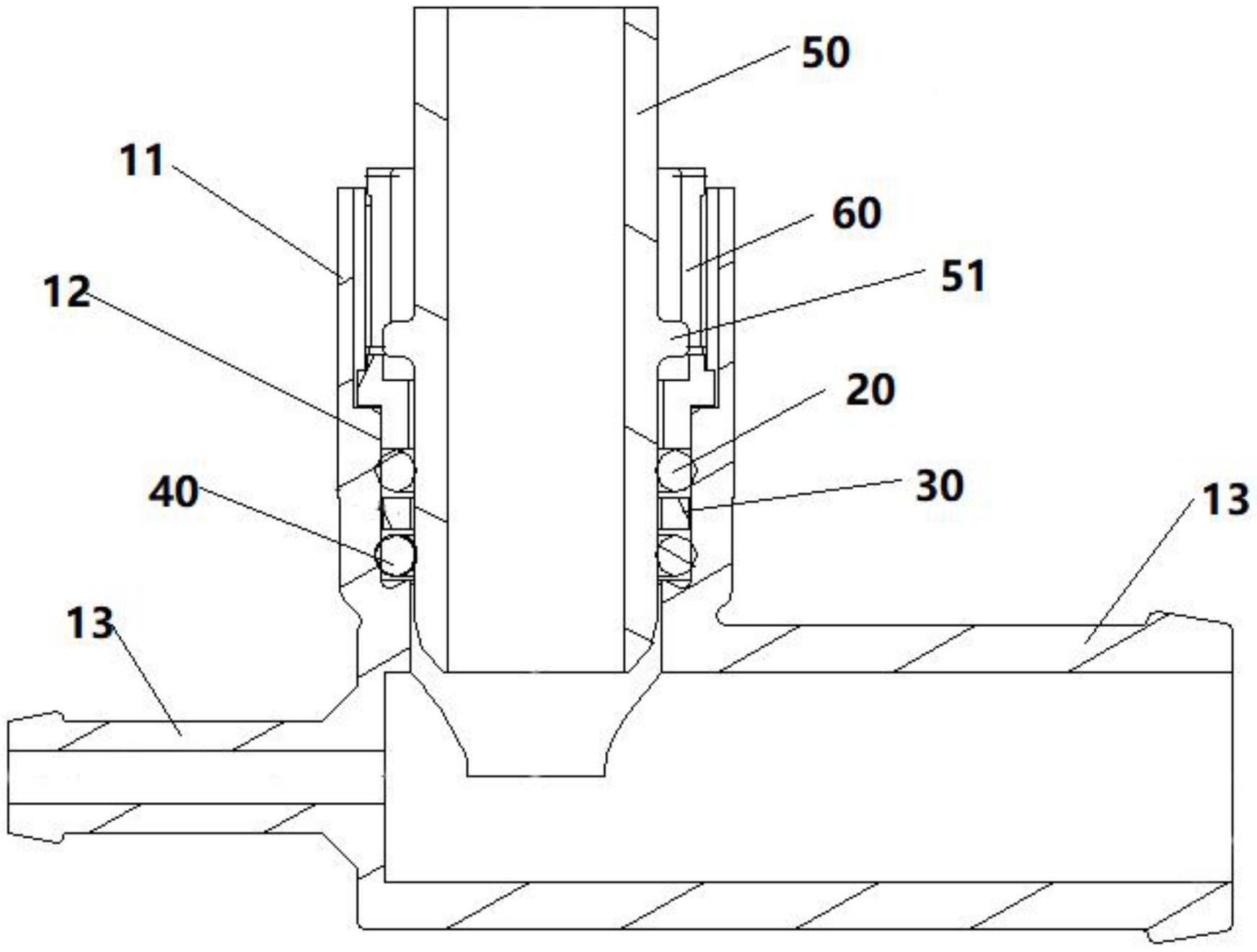 本实用新型公开了一种汽车冷却液的三通结构,包括三通本体,三通本体设有母接头端,母接头端的里端设有第一沉孔,第一沉孔沿其轴向依次设置有第一密封圈、隔离环、第二密封圈,母接头端用于插入公接头;母接头端的外端与公接头间设有锁簧,公接头外周设有凸起的卡子,卡子与锁簧形成卡接结构。采用本实用新型,在母接头端和公接头之间依次设有第一密封圈、隔离环、第二密封圈,通过设置两个密封圈,可有效地防止冷却液泄露,以保证连接处的安全性;通过在母接头端与公接头间设置锁簧,进一步增强母接头端与公接头连接处的稳定性,更好地防止冷却液的泄露。