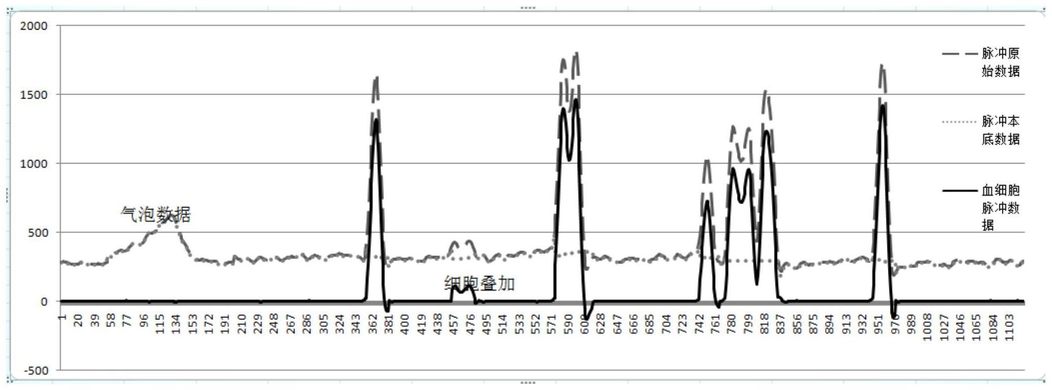 一种血细胞分析仪的脉冲信号分析识别方法属于信号分析识别处理领域,解决了现有技术中精准提取血细胞电脉冲信号数据的难度的问题。包括以下步骤:利用DC检测法,采集血细胞电脉冲信号数据;对采集得到的电脉冲数据进行分析处理,提取出不含有噪声及气泡等干扰数据的血细胞脉冲数据;分析计算每个血细胞电脉冲数据极值点的个数;根据每个血细胞电脉冲信号极值点的个数,统计出血细胞的总数;根据每个血细胞电脉冲极值点的极值大小,分析得出每个血细胞的体积大小。本发明能准确提取出血细胞电脉冲数据,排除噪声及气泡等数据对于提取血细胞脉冲数据的干扰,同时排除细胞堆叠等因素对于血细胞个数统计的干扰,准确统计出血细胞的大小、个数等信息。