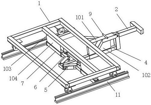 本实用新型公开了一种带刹车机构的轨道小车,包括设置于导轨上的车架,车架的末端侧壁上设有向外延伸的横梁,横梁上活动连接有踏板;所述横梁的下表面固定设有横向支撑,横向支撑内嵌套有横向导杆,横向导杆的一端与踏板的推动部件接触贴合,横向导杆的另一端活动连接有铰接板;所述车架上位于靠近铰接板的位置处固定设有纵梁,纵梁下表面的两端对称固定设有纵向支撑,纵向支撑内均嵌套有纵向导杆,所述纵向导杆的内侧端均通过销轴与铰接板活动连接,且纵向导杆的内侧端之间通过固定设有弹簧伸缩杆,所述纵向导杆的外侧端均固定设有刹车板,本实用新型具有结构简单,刹车制动效果稳定可靠,使用安全方便,且加工成本低等优点。