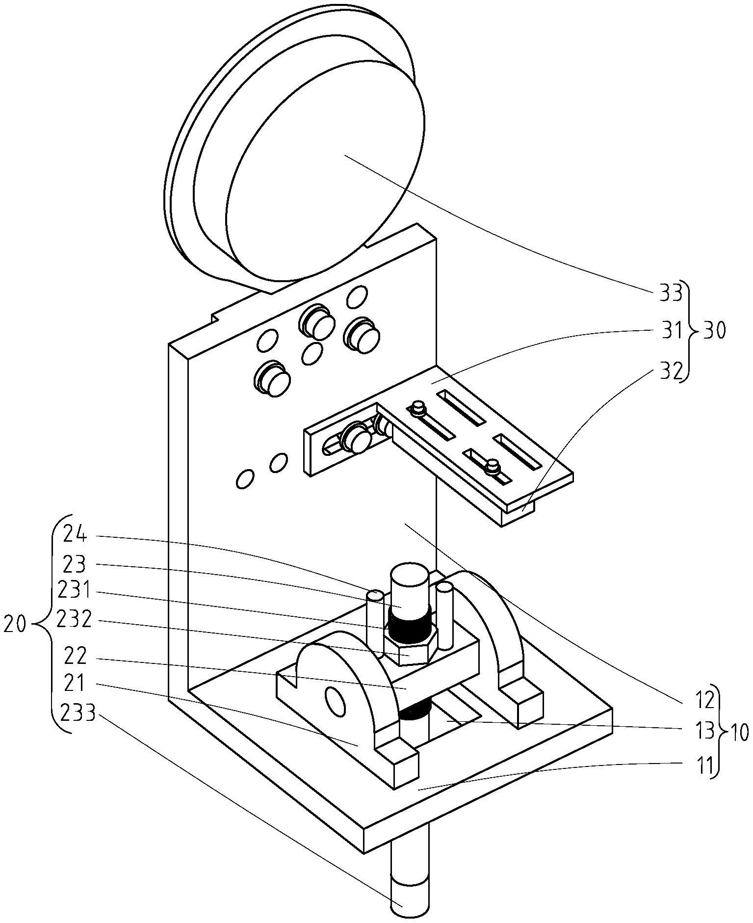 一种在线监测产品高度的工装,其包括一个安装架,一个放大组件,以及一个检测组件。所述放大组件包括一个摆轴,一个摆杆,以及偶数个平衡杆。所述摆杆的底部穿出所述摆轴的底部。所述检测组件包括一个光电感应器,以及一个设置在所述安装架顶部的声光报警器。所述光电感应器与所述平衡杆间隔设置。本在线监测产品高度的工装具有一个放大组件以及一个检测组件。所述放大组件将微小的高度变化放大,并由所述检测组件检测该变化,从而简化了整个装置的结构。所述光电感应器检测其与所述平衡杆之间的距离。当所述光电感应器检测到该距离发生变化后,所述声光报警器发出警报。