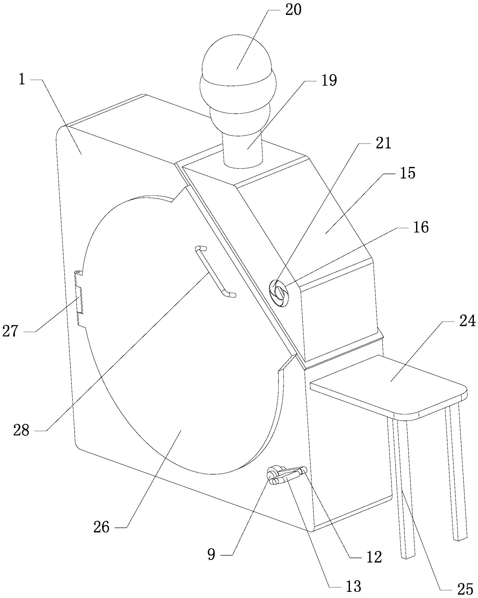 本实用新型涉及一种轮胎胎面打磨用除尘装置。它包括竖直设置的机座,所述机座的右上角呈倒角设置,在机座前侧侧壁中央开设置物槽,在机座右上角设有与置物槽相连通的操作通道,在置物槽中央水平设有固定轴,在固定轴上活动套接转筒,在转筒后端外侧壁上固定套接从动齿轮,在机座右下角沿其宽度方向水平设有转动槽,在对应从动齿轮位置的置物槽内壁上设有与转动槽相连通的传送通道,在转动槽内活动设有滑轴。它结构设计合理,操作方便,省时省力,可以有效将轮胎进行固定,无需频繁的翻动轮胎即可完成打磨,并且在打磨过程中,有效对粉尘进行有效收集,防止粉尘漂浮在空气中,危害维修人员的身体健康,解决了现有技术中存在的问题。