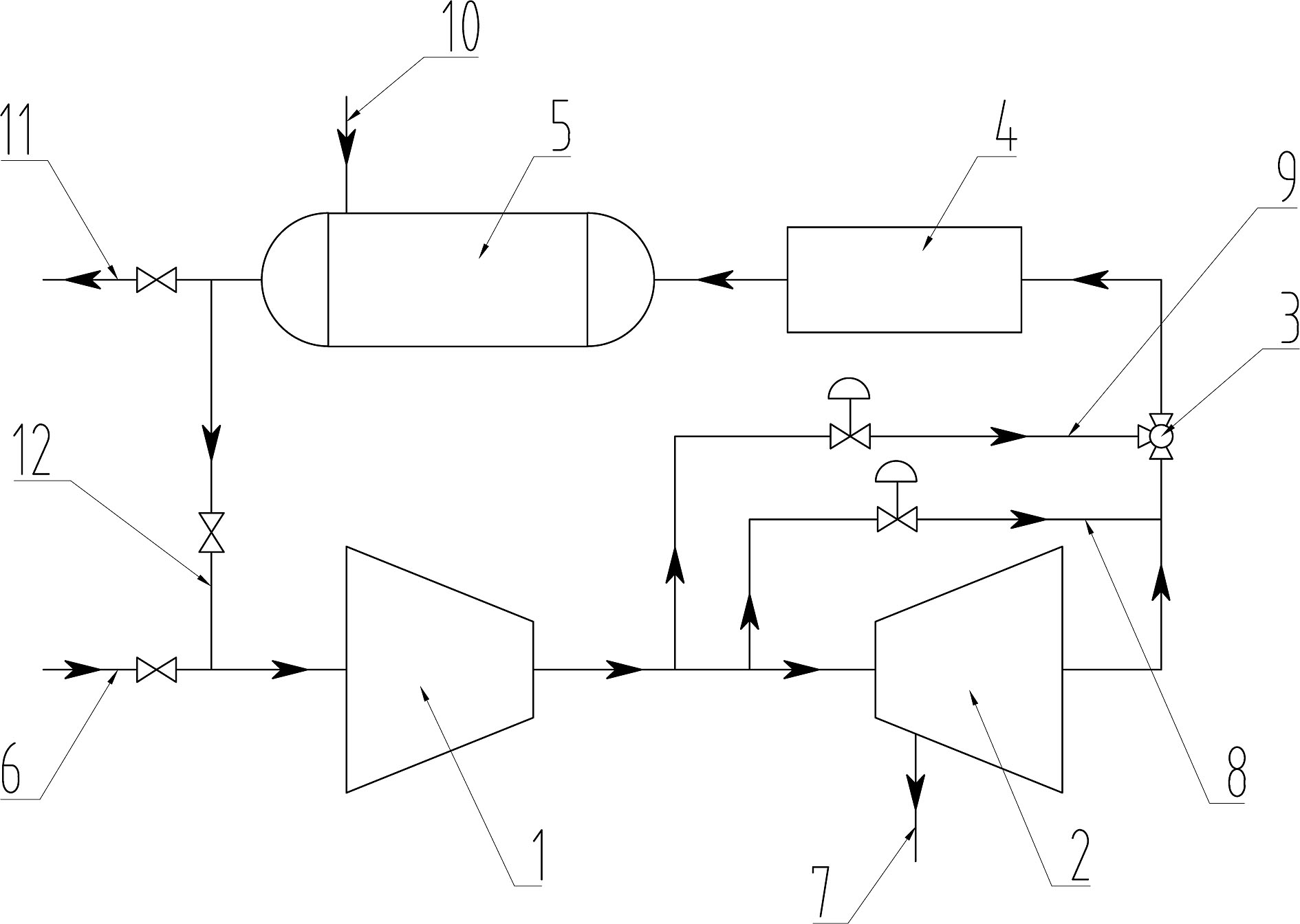 本实用新型提供了一种带膨胀储能的压缩机负荷试验系统,包括进气管线与排空管线,进气管线与排空管线之间依次连通有压缩机组、膨胀发电机组、调压撬以及缓冲罐,缓冲罐与压缩机组之间设有连通的循环管线;膨胀发电机组一侧设有并联的调压管线,调压管线两端与膨胀发电机组的两端连通;调压管线外侧设有并联的调温管线,调温管线两端与调压管线的两端连通。减少压缩机试验出口的降温降压装备及耗能;有效回收储能或利用压缩机试验的压力能;压缩气体实现闭式循环利用,减少特殊气体消耗,节约试验机组供气系统能耗;避免高压放空噪音污染;有效建立压缩机负荷试验压力需求,对试验效果有益。