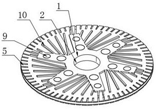本实用新型公开了一种耐磨高速陶瓷磨切锯片,包括基体,所述基体外侧安装有支撑片,所述支撑片底部安装有第一切割板,所述支撑片顶部安装有第二切割板,所述基体两端外侧均设有六个压片,所述压片内壁开设有两个通孔,所述通孔内壁填充有阻尼材料,所述压片一侧设有多个排屑板。本实用新型在工作过程中,压片可以随着锯片的工作一起磨损,增加了锯片的工作直径,减少了工作人员对锯片更换的效率,使得锯片具有更长的使用寿命,同时通孔的内部填充有阻尼材料,使得锯片具有更好的消音和散热效果,排屑板的设置使得工作过程中产生的碎屑可以便捷的排出,可以避免碎屑堆积增加对锯片的磨损,可以延长锯片的使用寿命。