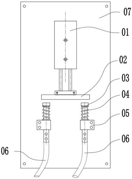本实用新型涉及开关装置领域,公开了一种大电流自动开关装置,包括固定绝缘安装板,所述固定绝缘安装板上方安装有下压气缸,所述下压气缸的气缸臂端部安装有紫铜连接排;所述固定绝缘安装板位于所述紫铜连接排下方处设有两条载流引线,所述两条载流引线上端端部均设有紫铜引接极,所述两条载流引线中部均安装有紫铜引接极绝缘滑套,所述紫铜引接极和所述紫铜引接极绝缘滑套之间连接有复位弹簧。本实用新型一种大电流自动开关装置在进行短路测试时,能够实现远距离控制操作,避免发生粘连的现象,防止发生火灾威胁工作人员的身体健康,结构简单,操作方便,适合在开关装置领域推广使用。
