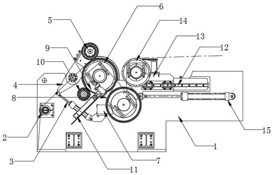 本发明公开了一种铝带加工用摩擦辊式张力装置,包括机架,机架的一侧铰接有压辊油缸,压辊油缸的活塞杆铰接有转动板,转动板与机架的侧壁转动连接,转动板的一端固定设有压辊,机架的一侧转动连接有两个摩擦辊,两个摩擦辊均与电机相连,其中一个摩擦辊的一侧固定连接有连接板,连接板的一侧固定设有过渡板,过渡板的一端固定设有大摆动齿轮,机架的一侧转动连接有与大摆动齿轮相啮合的小摆动齿轮,本发明的有益效果是:既可以弥补铝带材纵切后带材速差,又能实现卷取张力锥度控制,保证良好的带材表面加工质量,从而能够提升生产效率、成品率;还可以避免铝带与包胶辊圈之间滑动而划伤表面。