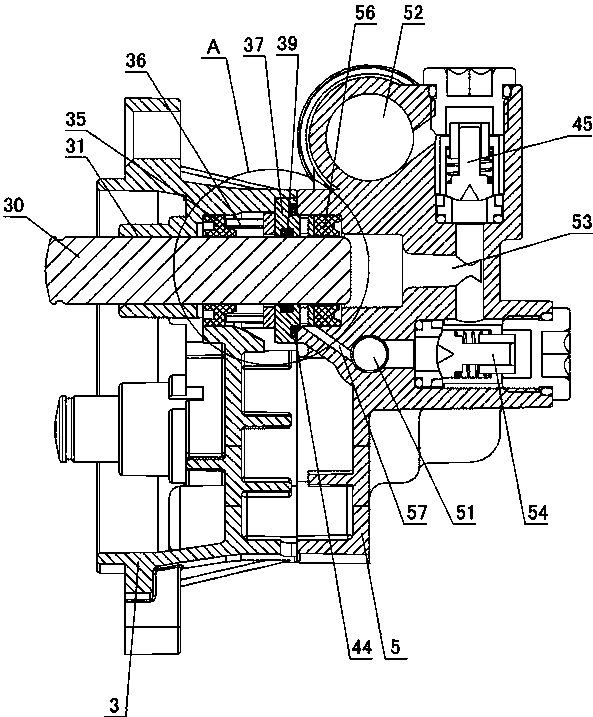 小型电动清洗机的油水混合阻断机构,包括电动机前端设连接座前端设泵体前端设泵头,电动机输出轴连接斜盘,斜盘上设平面轴承,泵体中开柱塞孔中设柱塞,柱塞一头与斜盘上平面轴承接触,泵头中制进水口、出水口和容腔,进水口连进水单向阀,出水口连出水单向阀,其特征在于所述泵体位于柱塞孔另一侧制油封安装槽、隔套槽和中间套槽,油封安装槽中设油封,隔套槽中设隔套,中间套槽中设中间套,中间套内壁制副水封槽,副水封槽中设副水封,中间套一侧制内、外环形凹槽,内、外环形凹槽之间制有4—8个小孔,泵头中制水封槽中设水封,水封槽位于水封一侧制曲折流道,曲折流道与进水口相通,油封、中间套、副水封和水封依次与柱塞外壁相接触。