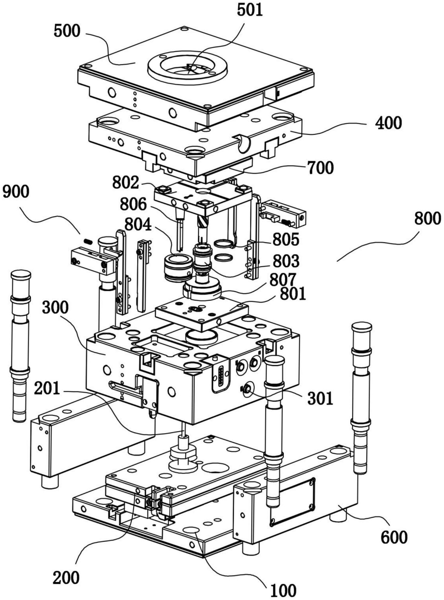 本实用新型涉及一种用于成型麻花状螺纹的注塑模具,包括模架,上模板上嵌设有上模仁;下模板上设有下模仁组件,下模仁组件包括分别嵌设在下模板上下两个端面上的模仁底板和模仁顶板,模仁底板和模仁顶板之间设置有螺纹丝套和冷却水套,螺纹丝套和所述冷却水套之间设有格莱圈;产品被顶出时,螺纹丝套被产品上的麻花螺纹带动,在格莱圈的作用下做自转。本实用新型的有益效果在于:1.与现有技术相比,本实用新型通过设置格莱圈使螺纹丝套能够相对冷却水套进行转动,同时通过向上的顶推力在倾斜的螺纹上产生的周面上的分力推动螺纹丝套的转动,巧妙地实现了产品的脱模取出,不仅节省了模具加工的成本,还提高了产品的生产效率,且不损伤产品。