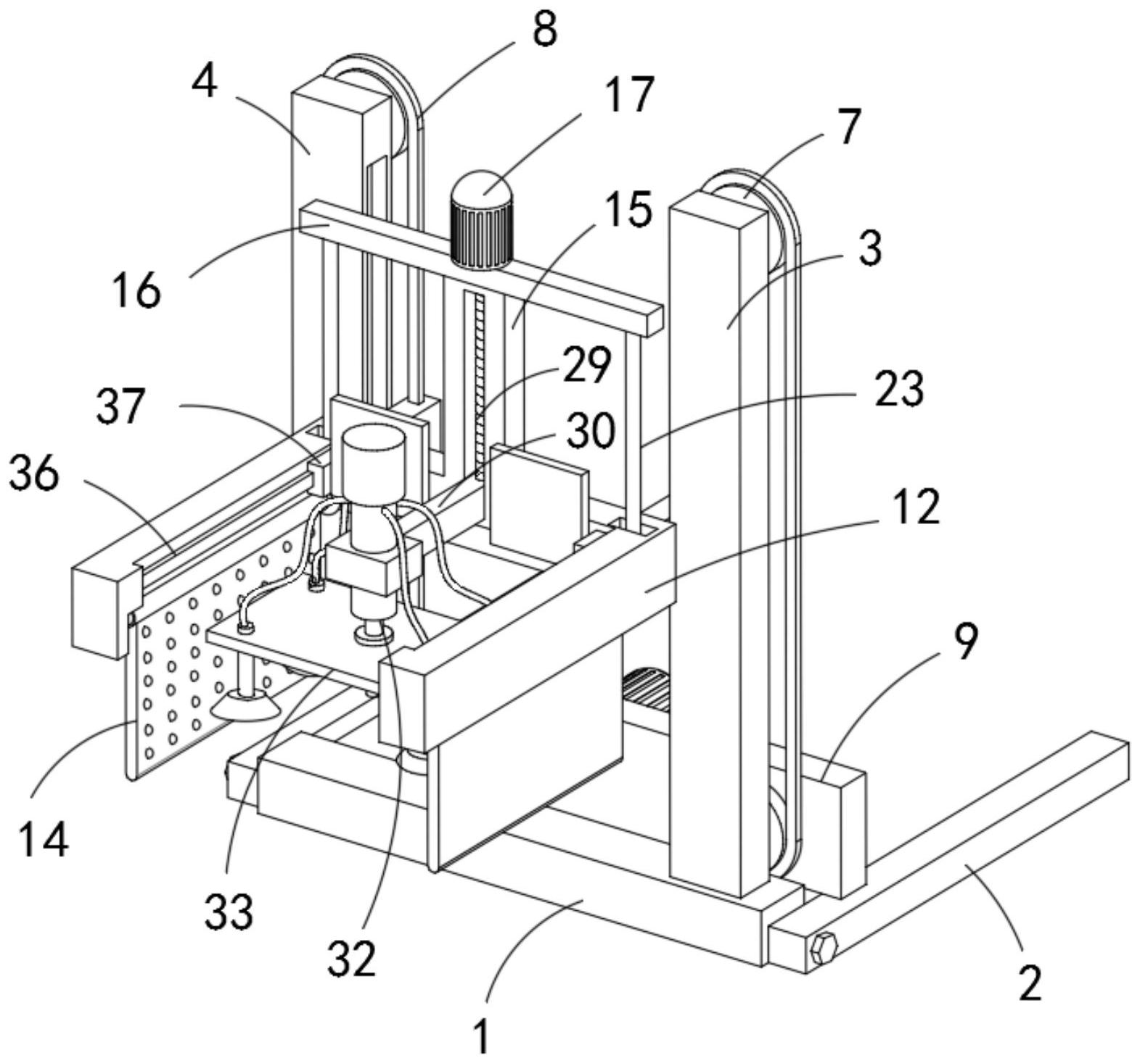 本发明属于传送机技术领域,尤其是涉及一种传送机,包括底板和两根支撑板,两根所述支撑板固定连接在底板的左右侧壁上,所述底板的上端固定连接有竖直的第一支柱和第二支柱,所述第一支柱和第二支柱的侧壁上分别转动连接有两根第一横轴和第二横轴,且两根第一横轴和第二横轴上下对应设置,所述第一横轴和第二横轴的外侧壁上均固定套接有链轮,且两根第一横轴以及两根第二横轴之间均由同一根链条传动,所述链条外侧的第一横轴和第二横轴的外侧壁上连接有同一矩形壳体。优点在于:本发明在传送前可以对货物进行自动提取工作,即不需要人为手动的搬运至传送板上,减轻了操作人员的工作强度,也符合物流自动化的控制管理。