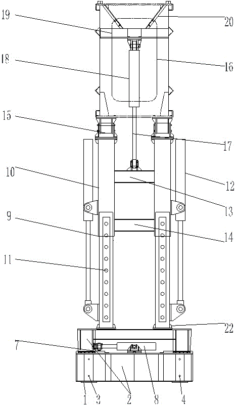 本实用新型涉及一种折叠伸缩支腿装置,它包括地梁,所述地梁上方固定有分配梁,分配梁左右两端设有左内套和右内套,所述左内套和右内套两侧设置有第一滑道,所述左内套和右内套之间设置有分配梁液压油缸,所述分配梁顶端还设置有第二滑道和横移油缸,所述分配梁上方还固定有伸缩导柱,所述伸缩导柱由外导套和内导柱组成,所述外导套上端一侧与顶升油缸底端连接,所述内导柱下端一侧与顶升油缸顶升端连接,所述外导套由中支腿上横梁和中支腿下横梁连接,所述伸缩导柱上端固定有绞座,所述中支腿上横梁与折叠油缸内导柱铰接,所述折叠油缸底端固定在主箱梁横梁上;本实用新型具有结构合理、工作效率高、安全程度高的优点。