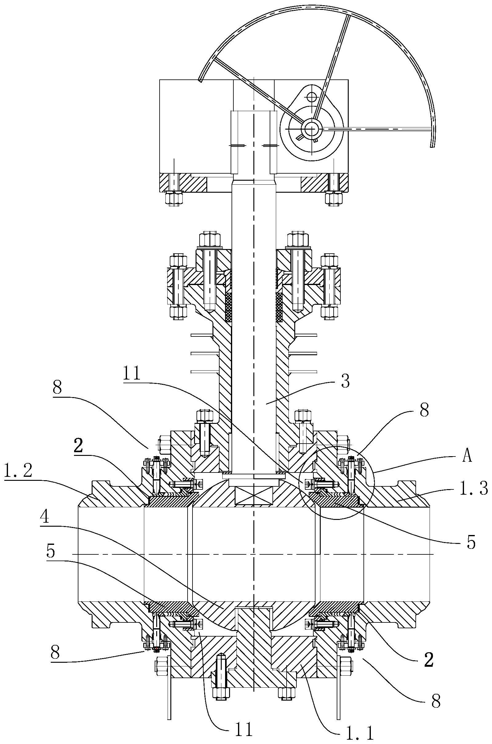 本发明公开了一种高温硬密封固定球阀,包括阀体以及设置于阀体内的安装槽,所述阀体上安装有穿设进阀体内部的阀杆,所述阀杆位于阀体内部的一端设有球体,所述安装槽内设有配合球体形成密封的阀座,所述安装槽与阀座之间形成有安装间距,所述安装间距内设有用于密封阀座与安装槽两者之间间隙的第一密封件,所述阀体外设有用于调节第一密封件密封等级的调节机构。本发明具有以下优点和效果:本发明通过在线调节第一密封件,既可以解决高温下出现的松弛泄漏,又能实现阀座正常地往复运动,保证密封可靠性。