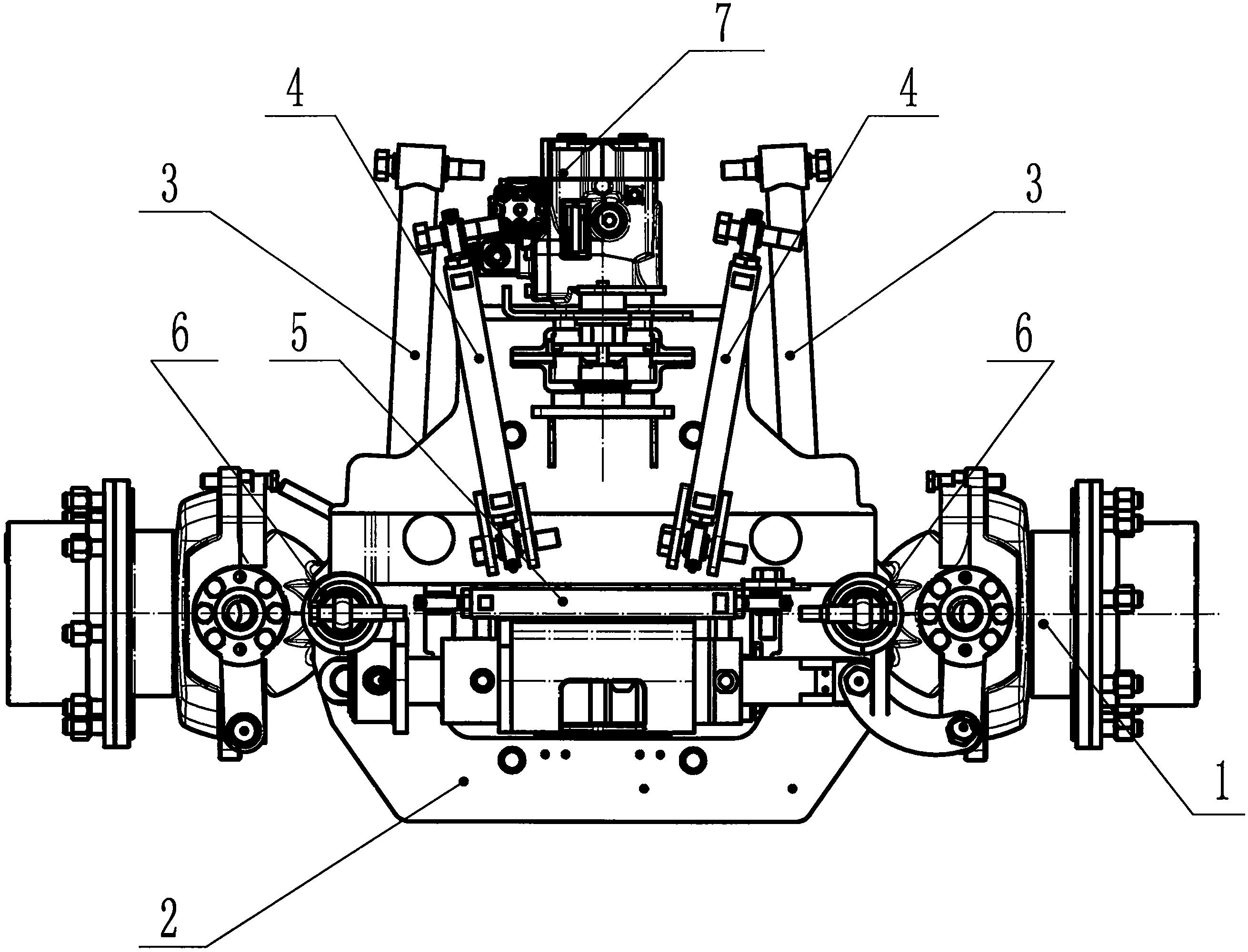 一种多功能工具车驱动悬挂装置,是由驱动桥、副车架、左拉杆、右拉杆、纵拉杆、横拉杆、减震器、驱动马达和制动器所组成,其特征在于,驱动桥安装在副车架上,驱动马达、制动器通过副车架与驱动桥连接,副车架安装在一端与车架铰接的左拉杆和右拉杆上,左拉杆、右拉杆上两端分别装有减震橡胶,同时副车架还通过两个纵拉杆、一个横拉杆和两个减震器与车架之间连接;车架和副车架的铰接处设有减震器,左拉杆、右拉杆的两端与车架和副车架的铰接处采用橡胶铰链;所述的多功能工具车驱动悬挂装置,左拉杆、右拉杆与车架、副车架的铰接处采用橡胶铰链。在恶劣的路况工作时,通过弹性体的变形,消除驱动桥悬挂装置各部件之间的相对运动。