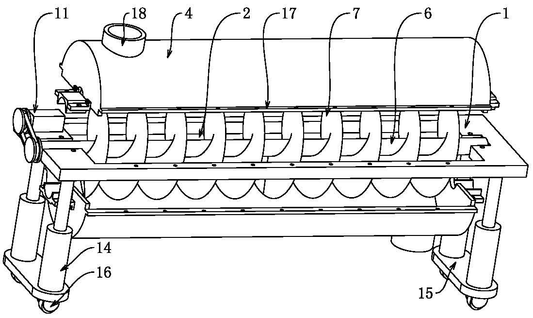 本实用新型公开了一种移动式自动输送上料装置,涉及到混泥土加工机械技术领域,该移动式自动输送上料装置,包括架板,所述架板的中部开设有上下贯通的圆弧通孔,所述架板的两端均开设有与圆弧通孔连通的插槽,所述圆弧通孔的内部转动安装有上料机构,所述上料机构的两端均插入插槽的内部;所述上料机构的外侧同轴设置有两个外壳,两个所述外壳均分别固定在架板的顶部和底部,所述上料机构的两端外侧均设置有两个定位卡板;本实用新型利用两个外壳配合架板组成上料机构的上料空间,拆卸时只需将螺母卸下就会全部分离,既方便了本装置的拆卸提高拆卸效果,同时也能够方便本装置的清洗,提高了本装置的清理效果。