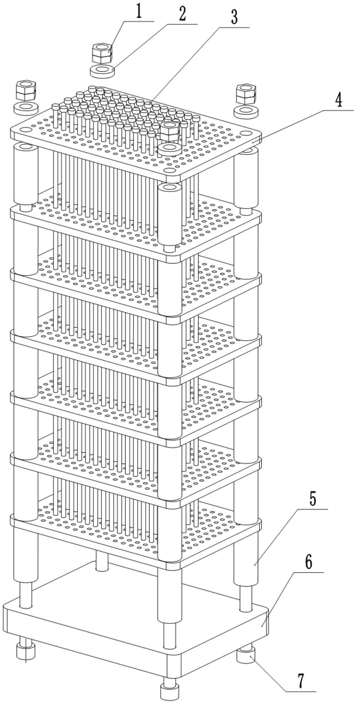 一种金属细长杆热处理防弯曲治具,涉及金属零件热处理领域。包括底座及连接于其上方的叠层刚性框架结构,所述叠层刚性框架结构包括多层定位板及用于连接各层定位板的螺栓,所述定位板上开设多个定位孔,所述定位孔每层位置相同,各定位板之间、定位板与底座之间均通过等高套分隔,所述等高套套接于螺栓上,所述螺栓穿过底座及各定位板的定位安装孔,上端依次套接垫片及螺母。本实用新型充分利用陶瓷材料高温不变形物理特点,治具所有零件均采用陶瓷材料,保证高温环境下,热膨胀系数一致,治具不变形,完好无损。本实用新型应用于实际生产中,使金属细长杆热处理变形得到非常有效控制。金属细长杆热处理后直线度在0.10mm以内的数量大幅度提高,不仅满足后续机加工要求,还减少了人工校直环节。对大批量生产金属细长杆的企业,极大提高生产效率,降低生产成本。