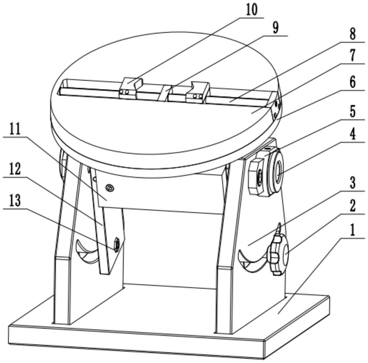 本实用新型属于逆向工程测量技术领域。一种用于三维扫描旋转夹具,夹具底板上设有支撑架,支撑架支撑转轴平台,转轴平台两端安装有角度调节装置,转轴平台通过扣环与轴承固定旋转轴,旋转轴与旋转平台连接;旋转平台上安装有固定平台;固定平台上安装有工作平台,工作平台上安装有夹具装置。本实用新型将待扫描的物件通过钳口夹持在工作平台上,转轴平台与旋转平台之间通过轴承缓慢转动,通过螺塞锁紧定位;同时通过支撑架两侧调整旋钮进行角度调节,可以达到多轴旋转;对待测物体的完整扫描,保证扫描件与点位的相对位置,且装夹方便,满足夹持、贴点和扫描效果,使用方便且能够获取扫描件的全面三维数据,提高扫描效率。