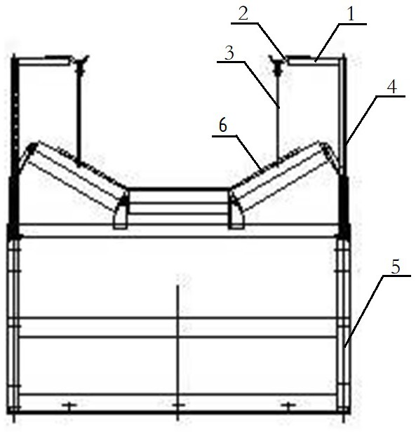 为解决现有皮带输送机在输送时产生物料外溅、粉料外溢的问题,本实用新型提供了一种皮带输送机挡帘装置,包括机架、吊挂支架、索具螺旋扣、挂绳、防水布,所述吊挂支架与机架固定连接,吊挂支架位于皮带的前端和末端,吊挂支架高于皮带面的最高点;索具螺旋扣和吊挂支架的顶部固定连接;防水布为两块,沿皮带长度方向竖直设在皮带的两侧;挂绳为两根,分别穿过防水布的顶部,将防水布悬挂;挂绳连接在索具螺旋扣上;其优点在于,结构简单,安装方便,成本低,易维护,可达到防溅料、防粉尘的效果,避免了环境污染、资源浪费以及产生的安全隐患,安全性高,绿色清洁。