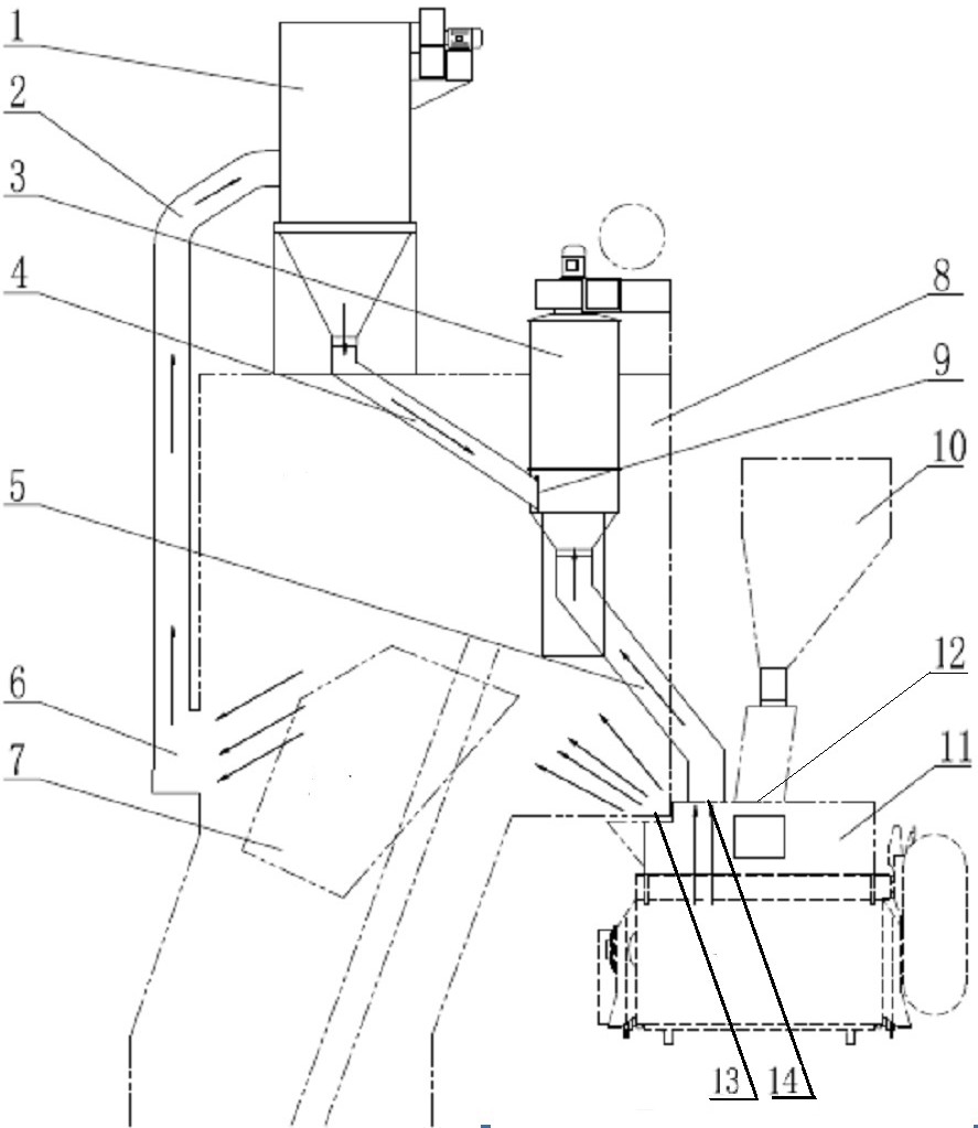 为解决现有提升式搅拌站除尘效果不理想、除尘器效率低、容易形成二次污染的问题,本实用新型提供了一种提升式搅拌站除尘装置,包括搅拌主机、投料口、抽尘口、副除尘管、副除尘器、过渡管、主除尘器、主除尘管、提升斗、轨道箱;所述搅拌主机上设有接收提升斗落料的投料口;投料口旁设有抽尘口;抽尘口与副除尘器通过副除尘管连通;副除尘器与主除尘器之间由过渡管连通,过渡管内设有从主除尘器方向往副除尘器方向开启的单向阀;轨道箱与主除尘器之间通过主除尘管连接;通过双除尘器协作,对粉尘全面吸收,除尘效率高,不易堵塞除尘口,回收的粉尘完全回到搅拌主机,不会产生二次污染,且通用性高。