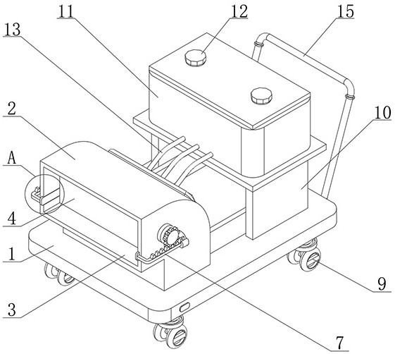 本实用新型公开了一种用于混凝土搅拌站的除尘装置,涉及空气净化技术领域,包括底板和开设有通孔的吸尘筒,通孔的内部两侧对称开设有滑槽,滑槽的内部活动连接有限位板,限位板位于通孔内的一端固定连接有过滤板,限位板远离过滤板的一端固定连接有齿条杆,底板的底部对称固定连接有减震柱,减震柱的底部固定连接有万向轮。本实用新型,通过在吸尘筒的内部设置过滤板,对飘扬的尘土除尘时进行初步过滤,防止浓度过大堵塞机器,通过滑槽、限位板和齿条杆的连接,使过滤板在通孔的一侧活动,通过第一电机、齿轮和限位杆的配合设置,带动齿条杆在限位杆顶部的凹槽内活动,使过滤板移出通孔清洗维护,提高除尘效率。