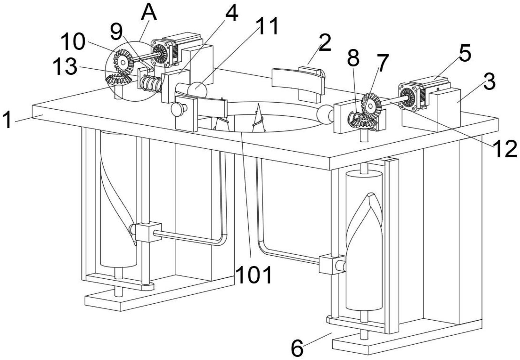 本实用新型公开了一种混凝土搅拌装置的防堵机构,属于混凝土搅拌辅助设备技术领域。一种混凝土搅拌装置的防堵机构,包括固定板,固定板顶面左右两侧均设有安装座,安装座顶面设有电动机,电动机输出轴端部连接有主轴,主轴前端连接有第一锥齿轮,主轴圆周外壁内侧固设有L形挡杆,主轴内侧设有固定块,固定块中部滑动连接有滑杆,滑杆内端固设有硅胶球,固定板底面下方左右两侧均设有疏通组件。本实用新型通过设置在主轴外壁内侧的L形挡杆,在电动机的作用下,主轴带动L形挡杆转动,弹簧向外伸长,当L形挡杆转动到一定程度,硅胶球向内侧移动对混凝土搅拌装置出料斗外壁进行敲击,防止混凝土粘附在出料斗内壁造成出料斗堵塞。