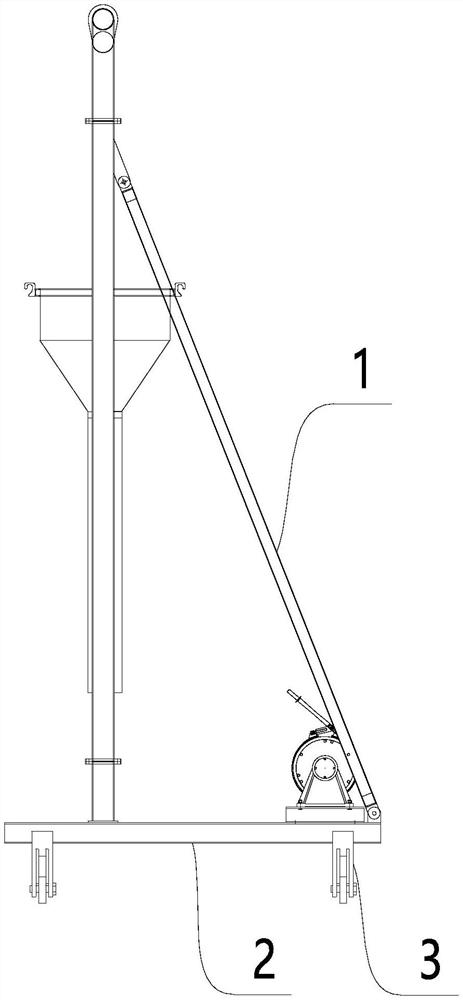 本实用新型涉及一种打桩用坑中快速围堰填充提升装置,包括灌桩机本体及位于灌桩机本体底部的底座,所述底座底部设有轨道机构,所述轨道机构包括安装在底座底部的车轮架,所述车轮架内设置有轨道轮,所述轨道轮底部设有轨道,所述轨道上设有多个第一定位孔,所述第一定位孔内穿设有限位件;本实用新型涉及一种打桩用坑中快速围堰填充提升装置,具有拆装方便、稳定性强、节省人力物力的优点。