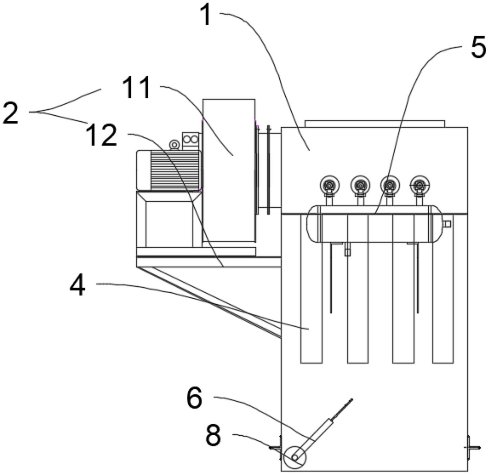本实用新型公开了一种混凝土搅拌站环保用降尘装置,包括上下端开口的箱体;抽气装置设置在位于箱体上端的开口处;安装板设置在箱体内;滤筒设置在均布在安装板上;脉冲发生器安装在箱体外,且脉冲发生器的输出端设置在滤筒上方;箱体上端开口设置在箱体一侧、下端开口设置在箱体底面。有益效果:空气进入到箱体时,部分空气直接进入或经过引导板上的通孔进入,另外一部分会经过引导板的阻隔,向引导板的引导方向流动,使得空气流向远离抽气装置的滤筒,使得带有灰尘的空气与这些滤筒充分接触,吸附掉空气中的灰尘,这样可以保持空气与每个滤筒接触的面积和时间之间的平衡,使得每个滤筒在相同时间段内吸附的灰尘量相似,能够提高除尘的效率。