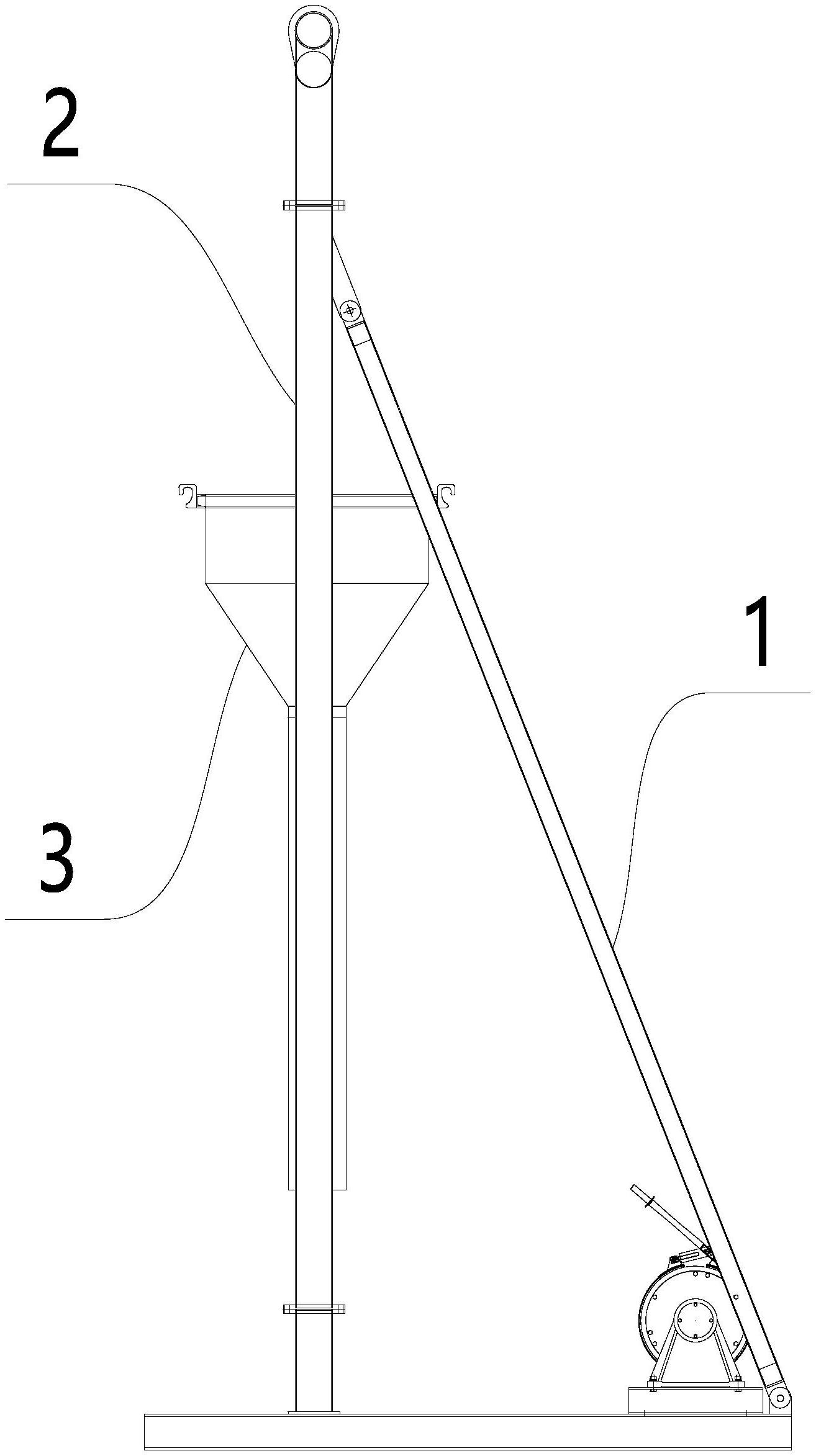本实用新型涉及一种灌桩机用提升装置,包括两个斜拉柱、与斜拉柱连接的两个立柱,所述立柱上设有滑轮箱,所述滑轮箱内沿竖直方向设有多个定滑轮,所述定滑轮上缠绕有拉绳,所述拉绳上连接牵引绳的一端,所述牵引绳的另一端与混凝土斗连接,所述滑轮箱设置在两个立柱上相互靠近的一侧,两个所述滑轮箱相互靠近的一侧均开设有牵引绳出口,所述牵引绳出口内设有牵引绳;本实用新型涉及一种灌桩机用提升装置,具有稳定效果好、便于拆装的优点。