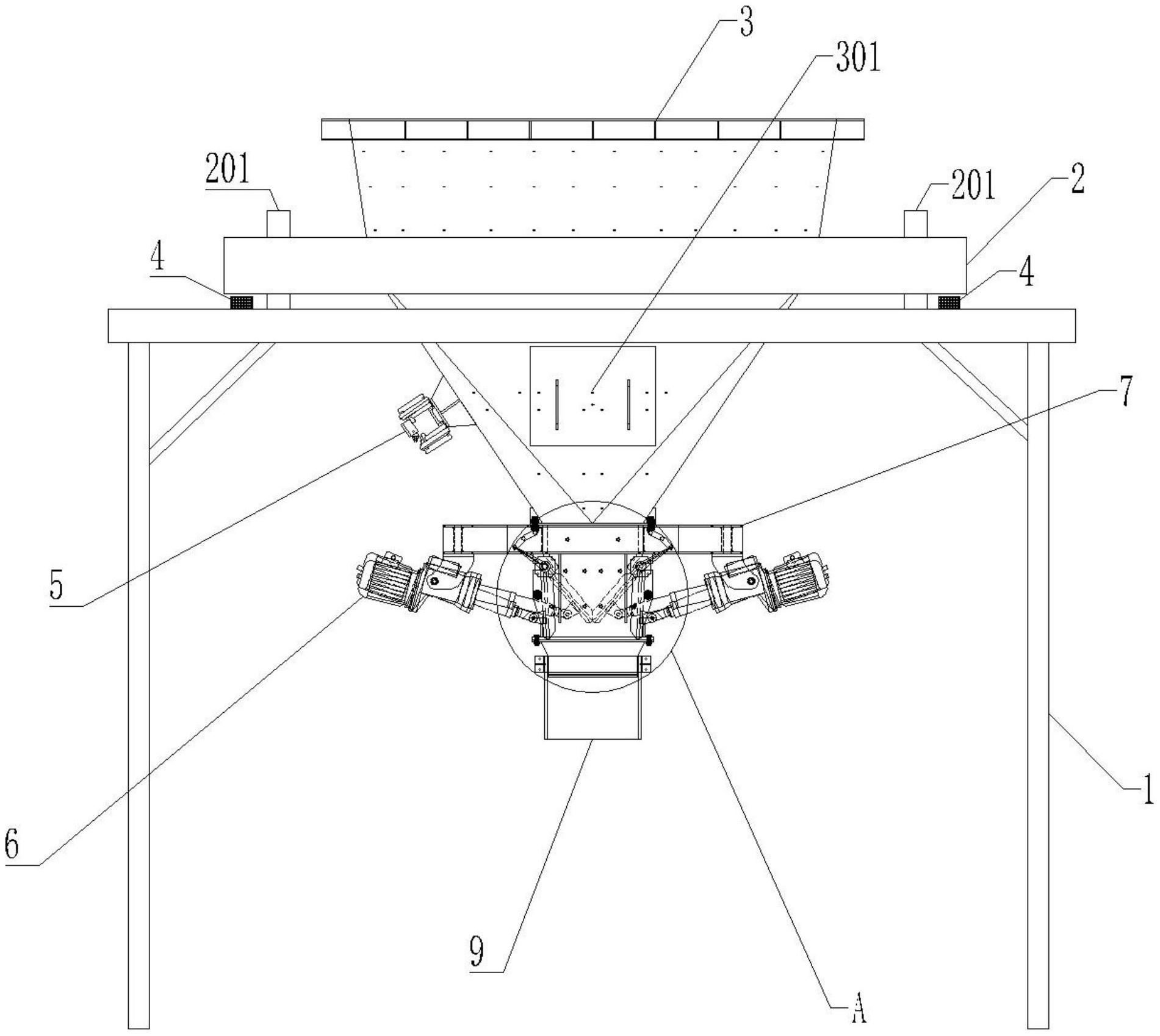 本实用新型公开了一种混凝土搅拌站水泥碎石混合料成品储料仓,包括支撑架,所述支撑架上设置有承重架,所述承重架上设置有料仓本体,所述料仓本体顶部设置进料口底部设置有方形出料口,所述出料口处设置有支架,所述支架上设置有用于控制出料口开合的开合装置,所述开合装置包括活动板一、活动板二、固定板一及固定板二,所述活动板一与活动板二的底部均沿水平方向设置有用于抵接的斜面,所述活动板一与活动板二均与设置在支架上的电动推杆的输出部铰接,所述支架与电动推杆通过固定件连接,精简了结构,实现了对混凝土装载量的精准控制,节约了生产成本,提高了生产效率。