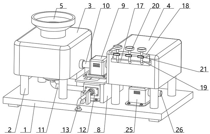 本实用新型公开了一种混凝土搅拌站用污水循环利用装置,涉及水处理技术领域,包括底板和用于安装沉淀箱的支撑柱,所述底板远离沉淀箱的一侧上表面固定安装有净化箱,所述沉淀箱的上表面插接有进料斗,所述沉淀箱的内部上表面固定连接有筛网,所述沉淀箱的下表面中部固定安装有承接盘。本实用新型,通过在底板的上表面设置沉淀箱和净化箱,搅拌站排出的污水通过进料斗进入沉淀箱内部,一定时间后,污水内的杂质凝固在沉淀箱底部,通过启动第一泵机,并通过连接管的配合,将除杂后的水输送进净化箱进行二次处理,通过启动泥浆泵,并通过导管和排污管的配合,将杂质排出,能够有效提升装置对污水的净化干净程度。