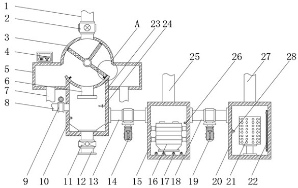 本实用新型公开了一种可以将污水循环再利用的污水处理装置,包括除杂筒,调节箱,生物处理箱和消毒净化箱,所述除杂筒顶部连通进水管,且进水管上安装有电磁阀,所述除杂筒底部焊接有调节箱,且除杂筒底部中央通过第一输水管连通调节箱,所述调节箱侧面连通第二输水管一端,且第二输水管另一端连通生物处理箱,并且第二输水管上安装有第一水泵,所述生物处理箱侧面连通第三输水管一端,且第三输水管另一端连通消毒净化箱,并且第三输水管上安装有第二水泵。有益效果:本实用新型实现了自动清理过滤格栅的功能,无需人工将过滤格栅拆卸进行清理,大大的节省了人力和物力,也提高了后续污水处理的工作效率,且自动化高,降低了污水处理的人工成本。